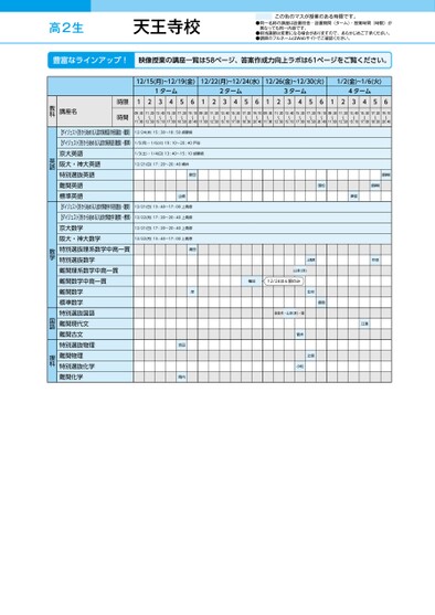 天王寺校豊富なラインアップ!映像授業の講座一覧は58ページ、答案作成力向上ラボは61ページをご覧ください。12/15(月)~12/19(金)12/22(月)~12/24(水)12/26(金)~12/30(火)1/2(金)~1/6(火)1ターム2ターム3ターム4ターム12345612345612345612345609:3011:2013:4015:3017:2019:1009:3011:2013:4015:3017:2019:1009:3011:2013:4015:3017:2019:1009:3011:2013:4015:3017:2019:1011:0012:5015:1017:0018:5020:4011:0012:5015:1017:0018:5020:4011:0012:5015:1017:0018:5020:4011:0012:5015:1017:0018:5020:4012/24(水)15:30〜18:50胡摩﨑1/5(月)・1/6(火)19:10〜20:40戸谷1/3(土)・1/4(日)13:40〜15:10胡摩﨑12/21(日)17:20〜20:40横井原田山崎12/21(日)13:40〜17:00上高原12/22(月)17:20〜20:40上高原12/21(日)17:20〜20:40上高原12/22(月)13:40〜17:00上高原湘田岸吉田岡内胡摩﨑胡摩﨑国松津留上高原山本(洋)中田権田12/24は6限のみ村北信岡佐佐木・山本(ま)・畑江濵菅井小松辻居時限時間講座名教科【ダイジェスト】冬から始める入試対策英語(特別選抜・難関)【ダイジェスト】冬から始める入試対策英語(難関・標準)京大英語阪大・神大英語特別選抜英語難関英語標準英語【ダイジェスト】冬から始める入試対策数学(特別選抜・難関)【ダイジェスト】冬から始める入試対策数学(難関・標準)京大数学阪大・神大数学特別選抜理系数学中高一貫特別選抜数学難関理系数学中高一貫難関数学中高一貫難関数学標準数学特別選抜国語難関現代文難関古文特別選抜物理難関物理特別選抜化学難関化学英語数学国語理科