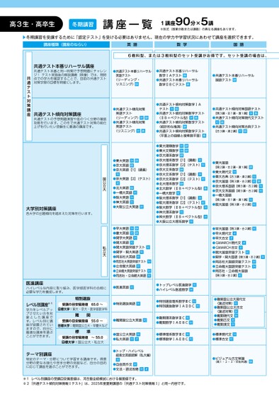 高3生・高卒生冬期講習講座一覧1講座90分×5講※形式(授業分数または講数)の異なる講座もあります。▶冬期講習を受講するために「認定テスト」を受ける必要はありません。現在の学力や学習状況にあわせて講座を選択できます。講座種類(講座のねらい)英語数学国語6教科型、または3教科型のセット受講がお得です。セット受講の場合は、●共通テスト本番リハーサル英語テスト(リーディング・リスニング)映●共通テスト本番リハーサル数学ⅠAテスト映●共通テスト本番リハーサル数学ⅡBCテスト映●共通テスト本番リハーサル国語テスト映●共通テスト傾向対策英語テスト(リーディング)対映●共通テスト傾向対策英語テスト(リスニング)対映●共通テスト傾向対策数学ⅠAテスト対映●共通テスト傾向対策数学テスト(ⅡB+ベクトル型)対映●共通テスト傾向対策数学テスト(統計的な推測)映●共通テスト傾向対策数学テスト(平面上の曲線と複素数平面)映●共通テスト傾向対策国語テスト【現3講・古1講・漢1講】対映●共通テスト傾向対策現代文テスト対映●共通テスト傾向対策古典テスト【古3講・漢2講】対映●東大理類数学対映●東大文類数学対映●京大理系数学映●京大理系数学【1】(講義)対●京大理系数学【2】(テスト)対●京大文系数学映●京大文系数学【1】(講義)対●京大文系数学【2】(テスト)対●北大理系数学映●北大数学(ⅡB+ベクトル型)映●一橋大数学対●阪大理系数学【1】(講義)対●阪大理系数学【2】(テスト)対●阪大数学(ⅡB+ベクトル型)対●神大理系数学対●神大数学(ⅡB+ベクトル型)対●大阪公立大理系数学対●東大国語【現2講・古2講・漢1講】映●東大現代文対●東大古典【古3講・漢2講】対●京大国語【現3講・古2講】対映●京大理系国語【現3講・古2講】対●京大文系国語【現3講・古2講】対●一橋大国語【現3講・古1講・漢1講】対●阪大国語【現3講・古2講】対●早大国語【現3講・古2講】対●早大現代文●早大古文●GMARCH現代文●GMARCH古文●関大国語突破テスト対●関学・関大国語【現3講・古2講】対●同志社大国語突破テスト対●立命館大国語突破テスト対●同志社・立命館大国語【現3講・古2講】対●東大英語対映●京大英語映●京大英語【1】(講義)対対●京大英語【2】(テスト)●北大英語映●一橋大英語対●阪大英語対●神大英語対●大阪公立大英語対●早大英語対映●慶大英語対映●関学大英語対●関大英語対●関大英語突破テスト対●関学・関大英語対●同志社大英語対●同志社大英語突破テスト対●立命館大英語対●立命館大英語突破テスト対●同志社・立命館大英語対共通テスト本番リハーサル講座共通テスト本番と同一時間で予想問題にチャレンジ!テスト実施後の解説講義(映像)では、現時点での学力を確認することで、目前の共通テスト対策学習の目標を明確にします。共通テスト傾向対策講座共通テストの予想問題演習や差のつく分野の徹底攻略を行います。この冬で共通テスト対策の総仕上げを行いたい受験生に最適の講座です。共通テスト対策講座国公立大私立大大学別対策講座各大学の出題傾向を踏まえた対策を行います。医進講座ハイレベルな内容に取り組み、医学部医学科の合格に必要な学力を養成します。●医進英語対●トップレベル医進数学対●ハイレベル医進数学対レベル別講座※1学力をレベルアップさせたい方を対象とした講座です。レベル別に講座が設置されていますので、自分に最適な講座を選ぶことができます。特別選抜受講の目安偏差値65.0〜目標大学:東大・京大・医学部医学科難関受講の目安偏差値55.0〜目標大学:難関国公立大・早慶大など標準受講の目安偏差値〜55.0目標大学:国公立大・私立大●特別選抜英語対●特別選抜理系数学ⅢC対●特別選抜数学ⅠAⅡBC対●難関国公立大英語対●難関理系数学ⅢC対●難関数学ⅠAⅡBC対●難関国公立大現代文(論述対策)対●難関国公立大古文(論述対策)対●難関現代文対●難関古文対●難関漢文対●国公立大英語対●私大英語対●標準理系数学ⅢC対●標準数学ⅠAⅡBC対●標準現代文対●標準古文対テーマ別講座特定のテーマ・分野について学習する講座です。得意分野の更なる強化や苦手分野の克服など、自分の目的に応じて講座を選ぶことができます。●トップ・ハイレベル超長文英語読解(私大編)対●自由英作文対●文法・語法攻略対※1レベル別講座の受講目安偏差値は、河合塾全統模試における偏差値です。※2「共通テスト傾向対策情報Ⅰテスト」は、2025年度夏期講習の「共通テスト対策情報Ⅰ」と同一内容です。●ビジュアル古文常識(高1・2・3・卒生共通)映