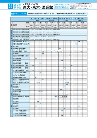 冬期講習高3生高卒生大阪北キャンパス東大・京大・医進館大阪校にのみ設置している講座もあります。25~27ページもあわせてご確認ください。●同一名称の講座は設置校舎・設置期間(ターム)・授業時間(時限)が異なっても同一内容です。●担当講師は変更になる場合がありますので、あらかじめこの色のマスが授業のある時限です。ご了承ください。●講師のフルネームはWebサイトでご確認ください。12/15(月)~12/19(金)12/22(月)~12/24(水)12/26(金)~12/30(火)1/2(金)~1/6(火)1ターム2ターム3ターム4ターム12345612345612345612345609:3011:2013:4015:3017:2019:1009:3011:2013:4015:3017:2019:1009:3011:2013:4015:3017:2019:1009:3011:2013:4015:3017:2019:1011:0012:5015:1017:0018:5020:4011:0012:5015:1017:0018:5020:4011:0012:5015:1017:0018:5020:4011:0012:5015:1017:0018:5020:4012/20(土)・12/21(日)時間割は22ページをご覧ください。解説講義は映像です。12/20(土)・12/21(日)時間割は22ページをご覧ください。解説講義は映像です。12/20(土)・12/21(日)時間割は22ページをご覧ください。解説講義は映像です。12/20(土)時間割は22ページをご覧ください。解説講義は映像です。12/20(土)・12/21(日)時間割は22ページをご覧ください。解説講義は映像です。瀬戸山瀬戸山西浦江本藤野池谷山下中畑畑・上阪畑中・松尾乾瀧澤古川小松木下胡摩﨑12/24は3限のみ藤野西浦藤野藤野山本(敏)山本(敏)崎中重幸・尾松中崎阪上・幸重中崎・阪上平田岡内12/24は5限のみ西尾瀧澤西尾古川西講座名時限時間共通テスト本番リハーサルテスト【理系6教科】校舎受験)共通テスト本番リハーサルテスト【文系6教科】校舎受験)共通テスト本番リハーサルテスト【理系3教科】校舎受験)共通テスト本番リハーサルテスト【文系3教科】校舎受験)共通テスト本番リハーサルテスト【英数国型】校舎受験)共通テスト傾向対策英語テスト(リーディング)共通テスト傾向対策英語テスト(リスニング)東大英語京大英語【1】講義)京大英語【2】テスト)医進英語共通テスト傾向対策数学ⅠAテスト東大理類数学東大文類数学京大理系数学【1】講義)京大理系数学【2】テスト)京大文系数学【1】講義)京大文系数学【2】テスト)トップレベル医進数学ハイレベル医進数学特別選抜理系数学ⅢC共通テスト傾向対策現代文テスト共通テスト傾向対策古典テスト東大現代文東大古典京大理系国語京大文系国語医系小論文共通テスト傾向対策化学テスト東大物理京大物理東大化学京大化学京大生物トップレベル医進物理トップレベル医進化学トップレベル医進生物教科共通テスト対策英語数学国語小論文理科