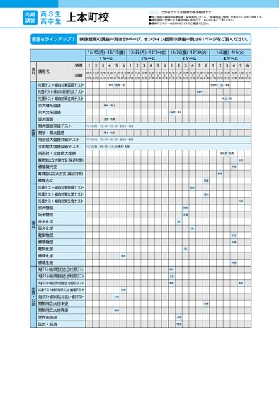 12/15(月)~12/19(金)12/22(月)~12/24(水)12/26(金)~12/30(火)1/2(金)~1/6(火)1ターム2ターム3ターム4ターム12345612345612345612345609:3011:2013:4015:3017:2019:1009:3011:2013:4015:3017:2019:1009:3011:2013:4015:3017:2019:1009:3011:2013:4015:3017:2019:1011:0012:5015:1017:0018:5020:4011:0012:5015:1017:0018:5020:4011:0012:5015:1017:0018:5020:4011:0012:5015:1017:0018:5020:40時限時間講座名教科佐佐木・上田・幸重佐佐木阪上・畑山本(和)・菅井佐佐木・松尾北野平田松尾大西松高中出大學大西松尾岡内内藤池本西池本大學西西高木上住松高上住竹村奥村・松尾・畑奥村・阪上北野・松尾12/22(月)13:40〜15:50佐佐木・松尾青木・松村12/23(火)13:40〜15:50佐佐木・松尾12/22(月)09:30〜12:50青木・松尾松尾・青木福井竹村竹村寺田共通テスト傾向対策国語テスト共通テスト傾向対策現代文テスト共通テスト傾向対策古典テスト京大理系国語京大文系国語阪大国語関大国語突破テスト関学・関大国語同志社大国語突破テスト立命館大国語突破テスト同志社・立命館大国語難関国公立大現代文(論述対策)標準現代文難関国公立大古文(論述対策)標準古文共通テスト傾向対策物理テスト共通テスト傾向対策化学テスト共通テスト傾向対策生物テスト京大物理阪大物理京大化学阪大化学難関物理標準物理難関化学標準化学標準生物共通テスト傾向対策歴史総合,日本史探究テスト共通テスト傾向対策歴史総合,世界史探究テスト共通テスト傾向対策地理総合,地理探究テスト共通テスト傾向対策公共,倫理テスト共通テスト傾向対策公共,政治・経済テスト関関同立大日本史関関同立大世界史世界史論述政治・経済国語理科地歴・公民上本町校