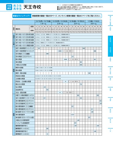 東大・京大・医進館大阪校上本町校天王寺校京都校神戸三宮校豊中高槻堺東岸和田西大寺八木12/15(月)~12/19(金)12/22(月)~12/24(水)12/26(金)~12/30(火)1/2(金)~1/6(火)1ターム2ターム3ターム4ターム12345612345612345612345609:3011:2013:4015:3017:2019:1009:3011:2013:4015:3017:2019:1009:3011:2013:4015:3017:2019:1009:3011:2013:4015:3017:2019:1011:0012:5015:1017:0018:5020:4011:0012:5015:1017:0018:5020:4011:0012:5015:1017:0018:5020:4011:0012:5015:1017:0018:5020:4012/20(土)・12/21(日)時間割は22ページをご覧ください。解説講義は映像です。12/20(土)・12/21(日)時間割は22ページをご覧ください。解説講義は映像です。12/20(土)・12/21(日)時間割は22ページをご覧ください。解説講義は映像です。12/20(土)時間割は22ページをご覧ください。解説講義は映像です。12/20(土)・12/21(日)時間割は22ページをご覧ください。解説講義は映像です。堂前胡摩﨑胡摩﨑12/24は3限のみ胡摩﨑江本﨑摩胡12/24は6限のみ1/2(金)〜1/4(日)11:20〜12:50津留1/4(日)〜1/6(火)11:20〜12:50津留12/23(火)17:20〜20:4012/24(水)17:20〜18:50慎12/22(月)17:20〜20:4012/23(火)17:20〜18:50慎慎慎慎12/24は5限のみ国松胡摩﨑戸谷胡摩﨑井横津留津留津留山崎西内影平湘田岸慎12/24は4限のみ前堂信岡影平山本(洋)上高原影平原高上浦西西浦上高原影平上高原影平原高上上高原講座名時限時間共通テスト本番リハーサルテスト【理系6教科】校舎受験)共通テスト本番リハーサルテスト【文系6教科】校舎受験)共通テスト本番リハーサルテスト【理系3教科】校舎受験)共通テスト本番リハーサルテスト【文系3教科】校舎受験)共通テスト本番リハーサルテスト【英数国型】校舎受験)共通テスト傾向対策英語テスト(リーディング)共通テスト傾向対策英語テスト(リスニング)京大英語【1】講義)京大英語【2】テスト)阪大英語神大英語大阪公立大英語関学大英語関大英語関学・関大英語同志社大英語立命館大英語同志社・立命館大英語国公立大英語私大英語自由英作文文法・語法攻略共通テスト傾向対策数学ⅠAテスト共通テスト傾向対策数学テスト(ⅡB+ベクトル型)京大理系数学【2】テスト)京大文系数学【2】テスト)阪大理系数学【1】講義)阪大理系数学【2】テスト)阪大数学(ⅡB+ベクトル型)神大理系数学神大数学(ⅡB+ベクトル型)大阪公立大理系数学ハイレベル医進数学難関理系数学ⅢC難関数学ⅠAⅡBC標準理系数学ⅢC標準数学ⅠAⅡBC教科共通テスト対策英語数学天王寺校