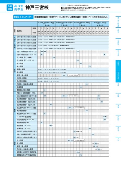 東大・京大・医進館大阪校上本町校天王寺校京都校神戸三宮校豊中高槻堺東岸和田西大寺八木12/15(月)~12/19(金)12/22(月)~12/24(水)12/26(金)~12/30(火)1/2(金)~1/6(火)1ターム2ターム3ターム4ターム12345612345612345612345609:3011:2013:4015:3017:2019:1009:3011:2013:4015:3017:2019:1009:3011:2013:4015:3017:2019:1009:3011:2013:4015:3017:2019:1011:0012:5015:1017:0018:5020:4011:0012:5015:1017:0018:5020:4011:0012:5015:1017:0018:5020:4011:0012:5015:1017:0018:5020:4012/20(土)・12/21(日)時間割は22ページをご覧ください。解説講義は映像です。12/20(土)・12/21(日)時間割は22ページをご覧ください。解説講義は映像です。12/20(土)・12/21(日)時間割は22ページをご覧ください。解説講義は映像です。12/20(土)時間割は22ページをご覧ください。解説講義は映像です。12/20(土)・12/21(日)時間割は22ページをご覧ください。解説講義は映像です。胡摩﨑胡摩﨑慎佐野千代堂前西内慎12/22(月)13:40〜17:0012/23(火)13:40〜15:10島田田12/23(火)13:40〜17:0012/24(水)13:40〜15:10島田田島田12/24は3限のみ12/28(日)〜12/30(火)17:20〜18:50久末12/26(金)〜12/28(日)17:20〜18:50久末堂前井駒12/24は4限のみ涌谷12/24は5限のみ藤野慎野藤岸岸藤田山本(洋)久末久末久末久末木村湘田山本(敏)湘田山本(敏)湘田寺尾平田平田・山本(ま)・八木瀬島・永松畑中・大村12/24は5限のみ平田・山本(ま)中田・大村中田・山本(ま)一番合戦伊賀講座名時限時間共通テスト本番リハーサルテスト【理系6教科】校舎受験)共通テスト本番リハーサルテスト【文系6教科】校舎受験)共通テスト本番リハーサルテスト【理系3教科】校舎受験)共通テスト本番リハーサルテスト【文系3教科】校舎受験)共通テスト本番リハーサルテスト【英数国型】校舎受験)共通テスト傾向対策英語テスト(リーディング)共通テスト傾向対策英語テスト(リスニング)京大英語【1】講義)京大英語【2】テスト)阪大英語神大英語関学大英語関大英語関学・関大英語同志社大英語立命館大英語同志社・立命館大英語医進英語難関国公立大英語共通テスト傾向対策数学ⅠAテスト共通テスト傾向対策数学テスト(ⅡB+ベクトル型)京大理系数学【2】テスト)京大文系数学【2】テスト)阪大理系数学【2】テスト)阪大数学(ⅡB+ベクトル型)神大理系数学神大数学(ⅡB+ベクトル型)ハイレベル医進数学特別選抜数学ⅠAⅡBC難関理系数学ⅢC難関数学ⅠAⅡBC標準数学ⅠAⅡBC共通テスト傾向対策国語テスト共通テスト傾向対策現代文テスト共通テスト傾向対策古典テスト京大国語阪大国語関学・関大国語同志社・立命館大国語難関国公立大現代文(論述対策)難関国公立大古文(論述対策)教科共通テスト対策英語数学国語神戸三宮校