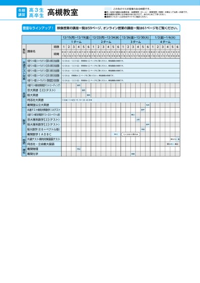 12/15(月)~12/19(金)12/22(月)~12/24(水)12/26(金)~12/30(火)1/2(金)~1/6(火)1ターム2ターム3ターム4ターム12345612345612345612345609:3011:2013:4015:3017:2019:1009:3011:2013:4015:3017:2019:1009:3011:2013:4015:3017:2019:1009:3011:2013:4015:3017:2019:1011:0012:5015:1017:0018:5020:4011:0012:5015:1017:0018:5020:4011:0012:5015:1017:0018:5020:4011:0012:5015:1017:0018:5020:4012/20(土)・12/21(日)時間割は22ページをご覧ください。解説講義は映像です。12/20(土)・12/21(日)時間割は22ページをご覧ください。解説講義は映像です。12/20(土)・12/21(日)時間割は22ページをご覧ください。解説講義は映像です。12/20(土)時間割は22ページをご覧ください。解説講義は映像です。12/20(土)・12/21(日)時間割は22ページをご覧ください。解説講義は映像です。堂前堂前堂前1/2(金)〜1/4(日)19:10〜20:40木多木多関口上村松井影平影平中田中川12/24は5限のみ中出宮路野口(た)・堀野口(た)・島田講座名時限時間共通テスト本番リハーサルテスト【理系6教科】校舎受験)共通テスト本番リハーサルテスト【文系6教科】校舎受験)共通テスト本番リハーサルテスト【理系3教科】校舎受験)共通テスト本番リハーサルテスト【文系3教科】校舎受験)共通テスト本番リハーサルテスト【英数国型】校舎受験)共通テスト傾向対策英語テスト(リーディング)京大英語【2】テスト)阪大英語同志社大英語難関国公立大英語共通テスト傾向対策数学ⅠAテスト共通テスト傾向対策数学テスト(ⅡB+ベクトル型)京大理系数学【2】テスト)阪大理系数学【2】テスト)阪大数学(ⅡB+ベクトル型)難関数学ⅠAⅡBC共通テスト傾向対策国語テスト同志社・立命館大国語難関物理難関化学教科共通テスト対策英語数学国語理科高槻教室