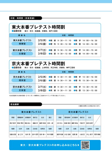 日程・時間割(校舎受講)東大本番プレテスト時間割東大・京大・医進館、京都校、神戸三宮校●設置校舎講座名東大本番プレテスト理類型東大本番プレテスト文類型日程・時間割2/5(木)●国語2/6(金)●理科2/7(土)●国語2/8(日)●地歴9:30〜11:109:30〜12:00●数学●英語14:00〜16:3014:00〜16:009:30〜12:009:30〜12:00●数学●英語14:00〜15:4014:00〜16:00京大本番プレテスト時間割●設置校舎東大・京大・医進館、上本町校、天王寺校、京都校、神戸三宮校講座名日程・時間割京大本番プレテスト理系型2/5(木)●国語2/6(金)●英語9:30〜11:009:30〜11:30●数学●理科13:30〜16:0013:30〜16:30京大本番プレテスト文系型2/7(土)●国語2/8(日)●英語9:30〜11:309:30〜11:30●数学●地歴13:30〜15:3013:30〜15:00※自宅受講の方は教材到着〜2/16(月)の期間内にご自身のタイミングで取り組んでください。担当講師※講師は変更になる場合があります。東大本番プレテスト京大本番プレテスト英語理類数学文類数学現代文古文漢文英語理系数学文系数学現代文古文高沢節子香坂季京岡田純一斎藤淳藤澤咲良三森一彦江本祐一西浦高志藤野真也中崎学松尾佳津子物理化学生物日本史世界史地理物理化学生物日本史世界史地理加藤武昭金仁守向井亮田中信司坂本新一中井隆顕瀧澤和樹小松知修西尾健小倉匡井上徳子河野貴樹東大・京大本番プレテストのお申し込みはこちら▶