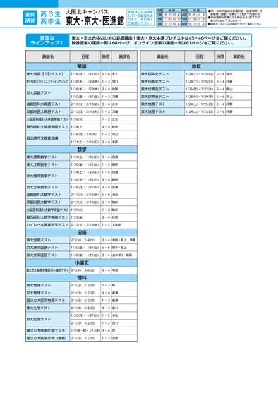 大阪北キャンパス東大・京大・医進館大阪校にのみ設置している講座もあります。あわせてご確認ください。講座名日程時限講師名講座名日程時限講師名東大日本史テスト京大日本史テスト東大世界史テスト京大世界史テスト東大地理テスト京大地理テスト地歴1/24(土)・1/25(日)5・6宮本1/24(土)・1/25(日)3・4小倉1/26(月)・1/27(火)3・4影山1/28(水)・1/29(木)5・6井上1/24(土)・1/25(日)3・4河野1/24(土)・1/25(日)5・6河野英語東大英語【1】テスト)1/26(月)・1/27(火)5・6木下東大英語【2】リスニング・インテンシブ)1/28(水)・1/29(木)1・2川口京大英語テスト滋賀医科大英語テスト京都府医大英語テスト1/28(水)・1/29(木)3・4佐野1/30(金)・1/31(土)1・2刀2/17(火)・2/18(水)3・4江本2/15(日)・2/16(月)1・2刀大阪医科薬科大英語突破テスト1/29(木)関西医科大英語突破テスト1/24(土)1・2江本3・4松井自由英作文徹底指導東大理類数学テスト東大文類数学テスト京大理系数学テスト京大文系数学テスト滋賀医科大数学テスト京都府医大数学テスト1/26(月)・2/9(月)1・2川口1/31(土)・2/15(日)3・4木原数学1/24(土)・1/25(日)3・4西浦1/30(金)・1/31(土)1・2藤野1/24(土)・1/25(日)1・2西浦1/30(金)・1/31(土)3・4藤野1/26(月)・1/27(火)3・4西浦2/17(火)・2/18(水)5・6池谷2/17(火)・2/18(水)3・4駒井大阪医科薬科大数学突破テスト1/27(火)関西医科大数学突破テスト1/23(金)1・2駒井3・4杉原ハイレベル医進数学テスト2/17(火)・2/18(水)1・2上高原国語東大国語テスト京大理系国語テスト京大文系国語テスト2/3(火)・2/4(水)3・4中崎・阪上・幸重1/30(金)・1/31(土)5・6畑中・阪上1/30(金)・1/31(土)3・4山本(和)・松尾国公立大後期対策医系小論文テスト3/5(木)・3/6(金)3・4平田小論文理科東大物理テスト京大物理テスト2/1(日)・2/2(月)1・2乾2/1(日)・2/2(月)3・4瀧澤国公立大医系物理テスト2/1(日)・2/2(月)1・2瀧澤東大化学テスト京大化学テスト2/1(日)・2/2(月)3・4古川1/26(月)・1/27(火)1・2小松2/1(日)・2/2(月)1・2古川国公立大医系化学テスト2/11(水・祝)・2/12(木)3・4西国公立大医系生物(講義)2/1(日)・2/2(月)1・2西尾