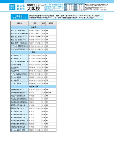 大阪北キャンパス大阪校東大・京大・医学部医学科対象の講座は東大・京大・医進館にも設置しています。あわせてご確認ください。講座名日程時限講師名小論文神大(法)後期小論文3/5(木)・3/6(金)3・4神坂神大・公立大(文)後期小論文3/3(火)・3/4(水)3・4山本慶大(文)小論文テスト1/28(水)・1/29(木)3・4山本慶大(法)小論文テスト1/26(月)・1/27(火)3・4神坂慶大(経済)小論文テスト1/22(木)・1/23(金)3・4神坂ファイナル人文・教育系対策小論文テスト2/17(火)・2/18(水)3・4山本ファイナル社会科学系対策小論文テスト2/19(木)・2/20(金)3・4神坂理科阪大物理テスト神大物理テスト2/13(金)・2/14(土)1・2乾2/13(金)・2/14(土)3・4乾ハイレベル頻出物理テスト2/17(火)・2/18(水)3・4瀧澤ファイナル物理阪大化学テスト神大化学テスト1/24(土)・1/25(日)3・4吉田2/11(水・祝)・2/12(木)3・4古川2/11(水・祝)・2/12(木)1・2古川ハイレベル頻出化学テスト2/19(木)・2/20(金)3・4古川ファイナル化学阪大生物テストファイナル生物1/26(月)・1/27(火)3・4岡内2/11(水・祝)・2/12(木)5・6西尾2/11(水・祝)・2/12(木)3・4西尾地歴・公民早慶大日本史テスト1/24(土)・1/25(日)5・6小倉関学大日本史突破テスト関大日本史突破テスト1/21(水)1/26(月)同志社大日本史突破テスト1/22(木)立命館大日本史突破テスト1/28(水)関関同立大日本文化史1/19(月)5・6勅使河原1・2内藤5・6木村3・4高木5・6中田1/24(土)・1/25(日)5・6上住早慶大世界史テスト阪大世界史テスト関学大世界史突破テスト関大世界史突破テスト2/12(木)1/28(水)1/22(木)同志社大世界史突破テスト1/21(水)立命館大世界史突破テスト1/23(金)関関同立大世界文化史1/19(月)5・6井上3・4井上5・6前田5・6影山5・6寺田5・6上住ファイナル政治・経済1/22(木)・1/23(金)5・6河合