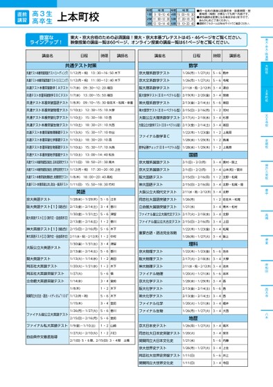 東大・京大・医進館大阪校上本町校天王寺校京都校神戸三宮校豊中高槻堺東岸和田西大寺八木上本町校講座名日程時限講師名講座名日程時限講師名共通テスト対策数学共通テスト本番突破英語テスト(リーディング)1/12(月・祝)13:30〜16:50木下共通テスト本番突破英語テスト(リスニング)1/12(月・祝)11:00〜12:40木下共通テスト本番突破数学ⅠAテスト1/7(水)09:30〜12:20湘田京大理系数学テスト京大文系数学テスト阪大理系数学テスト1/26(月)・1/27(火)5・6駒井1/26(月)・1/27(火)5・6寺尾2/11(水・祝)・2/12(木)3・4涌谷共通テスト本番突破数学ⅡBCテスト1/7(水)13:00〜15:50湘田阪大数学テスト(ⅡB+ベクトル型)2/19(木)・2/20(金)3・4宮崎共通テスト本番突破国語テスト1/8(木)09:10〜15:30佐佐木・松尾・幸重神大理系数学テスト2/13(金)・2/14(土)5・6湘田共通テスト本番突破物理テスト1/10(土)12:30〜15:10大學神大数学テスト(ⅡB+ベクトル型)2/15(日)・2/16(月)1・2河村共通テスト本番突破化学テスト1/10(土)15:30〜18:10西大阪公立大理系数学テスト2/17(火)・2/18(水)3・4杉原共通テスト本番突破生物テスト1/10(土)18:30〜21:10大西大阪公立大数学テスト(ⅡB+ベクトル型)2/13(金)・2/14(土)3・4湘田共通テスト本番突破物理基礎テスト1/13(火)15:30〜17:10中出共通テスト本番突破化学基礎テスト1/10(土)18:30〜20:10西ファイナル数学ⅢC1/22(木)・1/23(金)1・2上高原1/28(水)・1/29(木)1・2西浦共通テスト本番突破生物基礎テスト1/10(土)15:30〜17:10大西数学必勝チェック(ⅡB+ベクトル型)1/28(水)・1/29(木)1・2上高原共通テスト本番突破地学基礎テスト1/10(土)13:00〜14:40松永共通テスト本番突破歴史総合,日本史探究テスト1/11(日)18:50〜21:30高木共通テスト本番突破歴史総合,世界史探究テスト1/12(月・祝)17:20〜20:00上住共通テスト本番突破地理総合,地理探究テスト1/8(木)18:00〜20:40高松共通テスト本番突破公共,政治・経済テスト1/11(日)15:50〜18:30竹村英語京大英語テスト1/28(水)・1/29(木)5・6江本阪大英語テスト【1】総合)2/13(金)・2/14(土)3・4香川阪大英語テスト【2】英作文・自由英作文)1/30(金)・1/31(土)5・6津留2/13(金)・2/14(土)1・2香川神大英語テスト【1】総合)2/15(日)・2/16(月)5・6木下神大英語テスト【2】英作文・自由英作文)2/11(水・祝)・2/12(木)1・2中村国語京大理系国語テスト京大文系国語テスト阪大国語テスト神大国語テスト2/1(日)・2/2(月)3・4奥村・阪上2/1(日)・2/2(月)3・4山本(和)・菅井2/15(日)・2/16(月)1・2北野・松尾2/15(日)・2/16(月)3・4北野・松尾・畑大阪公立大現代文テスト2/11(水・祝)・2/12(木)3・4北野同志社大国語突破テスト立命館大国語突破テスト1/26(月)1/21(水)1・2佐佐木・松尾3・4青木・松村ファイナル国公立大現代文テスト2/17(火)・2/18(水)3・4北野ファイナル国公立大古文テスト2/15(日)・2/16(月)3・4上田重要古語・語法完全攻略1/22(木)・1/23(金)3・4松尾1/26(月)・1/27(火)3・4阪上大阪公立大英語テスト関大英語テスト同志社大英語テスト同志社大英語突破テスト立命館大英語突破テスト1/30(金)・1/31(土)3・4津留2/13(金)・2/14(土)5・6香川1/13(火)・1/14(水)1・2島田1/20(火)・1/21(水)1・2木下1/27(火)1/14(水)1/8(木)5・6慎3・4堂前1・2木下5・6木下3・4堂前関関同立大文法・語法・イディオム1/12(月・祝)1/15(木)ファイナル国公立大英語テスト1/26(月)・1/27(火)5・6香川2/15(日)・2/16(月)5・6堂前京大物理テスト阪大物理テスト神大物理テストファイナル物理京大化学テスト阪大化学テスト神大化学テストファイナル化学ファイナル生物理科1/22(木)・1/23(金)5・6池本2/17(火)・2/18(水)3・4大學2/11(水・祝)・2/12(木)3・4池本1/20(火)・1/21(水)5・6池本1/28(水)・1/29(木)3・4西2/13(金)・2/14(土)5・6西2/13(金)・2/14(土)3・4西1/20(火)・1/21(水)3・4福井1/26(月)・1/27(火)3・4大西地歴ファイナル私大英語テスト1/9(金)・1/10(土)1・2山崎京大日本史テスト1/26(月)・1/27(火)3・4高木自由英作文徹底指導1/27(火)・2/10(火)1・2川口同志社大日本史突破テスト1/20(火)2/1(日)5・6限、2/15(日)3・4限土橋関関同立大日本文化史1/21(水)3・4宮本5・6内藤京大世界史テスト1/26(月)・1/27(火)3・4上住同志社大世界史突破テスト1/11(日)関関同立大世界文化史1/11(日)5・6井上3・4寺田