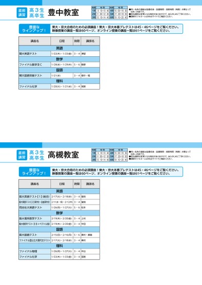 豊中教室講座名日程時限講師名英語関大英語テスト1/22(木)・1/23(金)3・4津留数学ファイナル数学ⅢC1/28(水)・1/29(木)5・6数野国語関大国語突破テスト1/21(水)3・4畑中・堀ファイナル化学1/20(火)・1/21(水)3・4宮路理科直前講習高3生高卒生高槻教室時限1限2限3限時間9:10〜10:4011:00〜12:3013:10〜14:40時限4限5限6限時間15:00〜16:3017:20〜18:5019:10〜20:40●同一名称の講座は設置校舎・設置期間・授業時間(時限)が異なっても同一内容です。●担当講師は変更になる場合がありますので、あらかじめご了承ください。●講師のフルネームはWebサイトでご確認ください。豊富なラインアップ!東大・京大合格のための必須講座!東大・京大本番プレテストは45・46ページをご覧ください。映像授業の講座一覧は60ページ、オンライン授業の講座一覧は61ページをご覧ください。講座名日程時限講師名英語阪大英語テスト【1】総合)2/17(火)・2/18(水)3・4堂前阪大英語テスト【2】英作文・自由英作文)2/11(水・祝)・2/12(木)3・4堂前同志社大英語テスト1/26(月)・1/27(火)5・6松本数学阪大理系数学テスト2/19(木)・2/20(金)3・4上村阪大数学テスト(ⅡB+ベクトル型)2/19(木)・2/20(金)3・4中田国語阪大国語テスト2/15(日)・2/16(月)5・6奥村・瀬島ファイナル国公立大現代文テスト2/17(火)・2/18(水)3・4奥村理科ファイナル物理ファイナル化学1/26(月)・1/27(火)3・4中出1/22(木)・1/23(金)3・4宮路