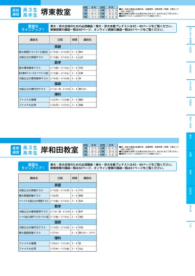 東大・京大・医進館大阪校上本町校天王寺校京都校神戸三宮校豊中高槻堺東岸和田西大寺八木堺東教室講座名日程時限講師名英語阪大英語テスト【1】総合)2/15(日)・2/16(月)5・6青木大阪公立大英語テスト2/13(金)・2/14(土)5・6山内数学阪大理系数学テスト2/13(金)・2/14(土)5・6中田阪大数学テスト(ⅡB+ベクトル型)2/13(金)・2/14(土)3・4杉原大阪公立大理系数学テスト2/15(日)・2/16(月)5・6岸国語大阪公立大現代文テスト2/11(水・祝)・2/12(木)3・4野口(た)理科ファイナル物理ファイナル化学1/22(木)・1/23(金)3・4植田1/26(月)・1/27(火)3・4宮路直前講習高3生高卒生岸和田教室時限1限2限3限時間9:10〜10:4011:00〜12:3013:10〜14:40時限4限5限6限時間15:00〜16:3017:20〜18:5019:10〜20:40●同一名称の講座は設置校舎・設置期間・授業時間(時限)が異なっても同一内容です。●担当講師は変更になる場合がありますので、あらかじめご了承ください。●講師のフルネームはWebサイトでご確認ください。豊富なラインアップ!東大・京大合格のための必須講座!東大・京大本番プレテストは45・46ページをご覧ください。映像授業の講座一覧は60ページ、オンライン授業の講座一覧は61ページをご覧ください。講座名日程時限講師名英語大阪公立大英語テスト2/15(日)・2/16(月)5・6千代関大英語突破テスト1/26(月)5・6敦見ファイナル国公立大英語テスト2/13(金)・2/14(土)3・4松井数学大阪公立大理系数学テスト2/11(水・祝)・2/12(木)3・4影平ファイナル国公立大数学テスト(ⅡB+ベクトル型)2/13(金)・2/14(土)5・6池田国語大阪公立大現代文テスト2/15(日)・2/16(月)3・4中田関大国語突破テスト1/27(火)5・6野口(た)・コヤマ理科ファイナル物理ファイナル化学1/20(火)・1/21(水)3・4乾1/22(木)・1/23(金)3・4北山