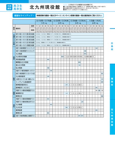 広島校福岡校北九州現役館12/15(月)~12/19(金)12/22(月)~12/24(水)12/26(金)~12/30(火)1/2(金)~1/6(火)1ターム2ターム3ターム4ターム12345612345612345612345609:30〜11:0011:20〜12:5013:40〜15:1015:30〜17:0017:20〜18:5019:10〜20:4009:30〜11:0011:20〜12:5013:40〜15:1015:30〜17:0017:20〜18:5019:10〜20:4009:30〜11:0011:20〜12:5013:40〜15:1015:30〜17:0017:20〜18:5019:10〜20:4009:30〜11:0011:20〜12:5013:40〜15:1015:30〜17:0017:20〜18:5019:10〜20:40時限時間講座名共通テスト本番リハーサルテスト【理系6教科】校舎受験)共通テスト本番リハーサルテスト【文系6教科】校舎受験)共通テスト本番リハーサルテスト【理系3教科】校舎受験)共通テスト本番リハーサルテスト【文系3教科】校舎受験)共通テスト本番リハーサルテスト【英数国型】校舎受験)共通テスト傾向対策英語テスト(リーディング)共通テスト傾向対策英語テスト(リスニング)九大英語九大英作文特講特別選抜英語難関国公立大英語国公立大英語私大英語共通テスト傾向対策数学ⅠAテスト共通テスト傾向対策数学テスト(ⅡB+ベクトル型)九大理系数学九大数学(ⅡB+ベクトル型)-難関大レベル-トップレベル医進数学標準理系数学ⅢC標準数学ⅠAⅡBC共通テスト傾向対策国語テスト難関現代文標準古文共通テスト傾向対策物理テスト共通テスト傾向対策化学テスト九大物理九大化学標準物理標準化学共通テスト傾向対策地理総合,地理探究テスト12/20(土)・12/21(日)時間割は13ページをご覧ください。解説講義は映像です。12/20(土)・12/21(日)時間割は13ページをご覧ください。解説講義は映像です。12/20(土)・12/21(日)時間割は13ページをご覧ください。解説講義は映像です。12/20(土)時間割は13ページをご覧ください。解説講義は映像です。12/20(土)・12/21(日)時間割は13ページをご覧ください。解説講義は映像です。永冨永冨堤(英)堤(英)九大以外で英作文を課す大学の対策としても効果的な講座です。堤(英)久我清水大坪龍頭清水莵原・重盛・寺島重盛原田波平12/24(水)は5限のみ土井12/24(水)は5限のみ山本野村12/24(水)は5限のみ瀬川瀬川柴田(祐)柴田石原永冨石原本村宮本野村教科共通テスト対策英語数学国語理科地歴冬期講習高3生高卒生北九州現役館この色のマスが授業のある時限です。●同一名称の講座は設置校舎・設置期間(ターム)・授業時間(時限)が異なっても同一内容です。●担当講師は変更になる場合がありますので、あらかじめご了承ください。●講師のフルネームはWebサイトでご確認ください。●2025年度/冬期講習/九州/北九州現役館/高3・卒生/パターン14452025_57_7_745_11_20250717131537.csv/1ページ校了時削除