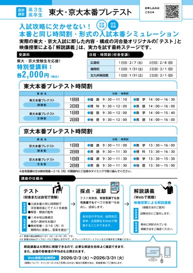直前講習高3生高卒生東大・京大本番プレテストお申し込みはこちら▶校舎受講自宅受講入試攻略に欠かせない!本番と同じ時間割・形式の入試本番シミュレーション実際の東大・京大入試に即した内容・構成の河合塾オリジナルの「テスト」と映像授業による「解説講義」は、実力を試す最終ステージです。受講料日程・時間割(校舎受講)東大・京大受験生を応援!特別受講料:各2,000円(税込)広島校福岡校1日目:2/7(土)2日目:2/8(日)1日目:1/31(土)2日目:2/1(日)北九州現役館1日目:1/31(土)2日目:2/1(日)東大本番プレテスト時間割講座名東大本番プレテスト理類型東大本番プレテスト文類型日程・時間割1日目2日目1日目2日目●国語9:30〜11:10●数学14:00〜16:30●理科9:30〜12:00●英語14:00〜16:00●国語9:30〜12:00●数学14:00〜15:40●地歴9:30〜12:00●英語14:00〜16:00京大本番プレテスト時間割講座名京大本番プレテスト理系型京大本番プレテスト文系型日程・時間割1日目2日目1日目2日目●国語9:30〜11:00●数学13:30〜16:00●英語9:30〜11:30●理科13:30〜16:30●国語9:30〜11:30●数学13:30〜15:30●英語9:30〜11:30●地歴13:30〜15:00※自宅受講の方は教材到着〜2/16(月)の期間内にご自身のタイミングで取り組んでください。〈視聴方法のご案内〉試験当日にご案内します。教材に同封されている視聴方法をご確認ください。校舎受講自宅受講解説講義(Webで視聴)映像授業による解説講義採点・返却テスト実施後、校舎受講でも自宅受講でもすべての答案※2を採点し、返却します。各科目の平均点・設問別正答率・全国順位をWebで閲覧することができます。●入試本番と同じ時間割で河合塾校舎にてテストを実施●解答・解説の配布●1月中旬以降順次自宅へ教材をお届け●教材到着〜2/16(月)の期間内に受験し、答案を提出※1校舎受講自宅受講テスト(校舎または自宅で受験)講座の仕組み※1答案の提出期間は1/21(水)〜2/16(月)です。※2答案はWebアップロードにて提出しますので、タブレットやスマートフォンなどの端末をご準備ください。解説講義は大問別に視聴できるので、必要な解説を効率よく確認できます。また、全国の受験者の平均点も公開されます。Web視聴可能期間▶2026/2/3(火)〜2026/3/31(火)〈視聴について〉※インターネットをご利用になれない場合の視聴方法は、実施要項にてご案内します。