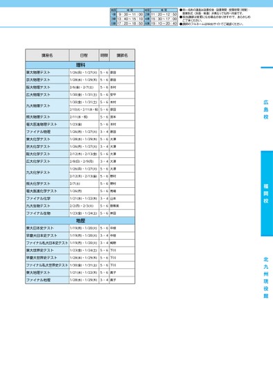 広島校福岡校北九州現役館●同一名称の講座は設置校舎・設置期間・授業時間(時限)・授業形式(対面・映像)が異なっても同一内容です。●担当講師は変更になる場合がありますので、あらかじめご了承ください。●講師のフルネームはWebサイトでご確認ください。時限1限3限5限時間9:30〜11:0013:40〜15:1017:20〜18:50時限2限4限6限時間11:20〜12:5015:30〜17:0019:10〜20:40講座名日程時限講師名東大物理テスト京大物理テスト阪大物理テスト広大物理テスト九大物理テスト理科1/26(月)・1/27(火)5・6原田1/28(水)・1/29(木)5・6原田2/6(金)・2/7(土)5・6本村1/30(金)・1/31(土)5・6安平1/30(金)・1/31(土)5・6本村2/10(火)・2/11(水・祝)5・6原田熊大物理テスト2/11(水・祝)福大医進物理テスト1/23(金)5・6宮本5・6本村ファイナル物理東大化学テスト京大化学テスト阪大化学テスト広大化学テスト九大化学テスト1/26(月)・1/27(火)3・4原田1/28(水)・1/29(木)5・6大澤1/26(月)・1/27(火)3・4大澤2/12(木)・2/13(金)5・6大澤2/8(日)・2/9(月)3・4大澤1/26(月)・1/27(火)5・6大澤2/12(木)・2/13(金)5・6野村熊大化学テスト福大医進化学テスト2/7(土)1/26(月)5・6野村5・6馬場ファイナル化学九大生物テストファイナル生物1/21(水)・1/22(木)3・4山本2/2(月)・2/3(火)5・6野黒美1/23(金)・1/24(土)5・6岸田地歴東大日本史テスト早慶大日本史テスト1/19(月)・1/20(火)5・6中垣1/19(月)・1/20(火)3・4中垣ファイナル私大日本史テスト1/19(月)・1/20(火)3・4梅野東大世界史テスト早慶大世界史テスト1/23(金)・1/24(土)5・6下川1/28(水)・1/29(木)5・6下川ファイナル私大世界史テスト1/30(金)・1/31(土)5・6下川東大地理テストファイナル地理1/21(水)・1/22(木)5・6子1/28(水)・1/29(木)3・4子