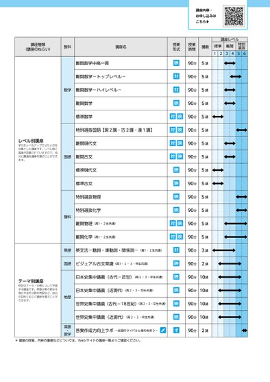 講座内容・お申し込みはこちら▶講座レベル標準12難関34特別選抜56講座種類(講座のねらい)教科講座名難関数学中高一貫難関数学-トップレベル-数学難関数学-ハイレベル-難関数学標準数学授業形式授業時間講数映対対映90分5講90分5講90分5講90分5講対映90分5講特別選抜国語【現2講・古2講・漢1講】対映90分5講レベル別講座学力をレベルアップさせたい方を対象とした講座です。レベル別に講座が設置されていますので、自分に最適な講座を選ぶことができます。難関現代文国語難関古文標準現代文標準古文特別選抜物理特別選抜化学理科難関物理(高1・2生共通)難関化学(高1・2生共通)対映90分5講対映90分5講映映映映90分5講90分5講90分5講90分5講対映90分5講対映90分5講テーマ別講座特定のテーマ・分野について学習する講座です。得意分野の更なる強化や苦手分野の克服など、自分の目的に応じて講座を選ぶことができます。英語英文法-動詞・準動詞・関係詞-(高1・2生共通)国語ビジュアル古文常識(高1・2・3・卒生共通)日本史集中講義(古代-近世)(高2・3・卒生共通)日本史集中講義(近現代)(高2・3・卒生共通)世界史集中講義(古代-18世紀)(高2・3・卒生共通)世界史集中講義(近現代)(高2・3・卒生共通)答案作成力向上ラボ-全国のライバルと高めあおう-地歴英語数学・対映映映映映オ90分3講90分2講90分10講90分10講90分10講90分10講90分2講*講座の詳細、内容の重複などについては、Webサイトの講座一覧よりご確認ください。