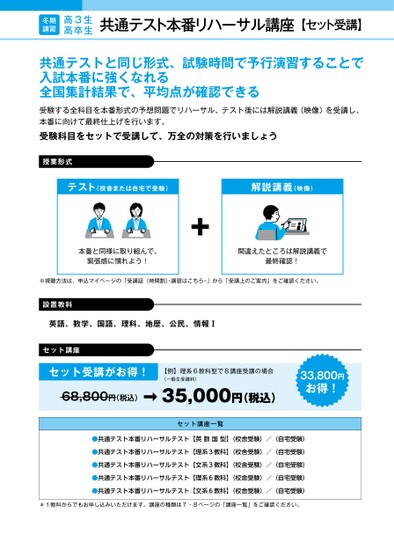 冬期講習高3生高卒生共通テスト本番リハーサル講座【セット受講】共通テストと同じ形式、試験時間で予行演習することで入試本番に強くなれる全国集計結果で、平均点が確認できる受験する全科目を本番形式の予想問題でリハーサル、テスト後には解説講義(映像)を受講し、本番に向けて最終仕上げを行います。受験科目をセットで受講して、万全の対策を行いましょう授業形式テスト(校舎または自宅で受験)解説講義(映像)本番と同様に取り組んで、緊張感に慣れよう!間違えたところは解説講義で最終確認!※視聴方法は、申込マイページの「受講証(時間割)ー講習はこちらー」から「受講上のご案内」をご確認ください。設置教科英語、数学、国語、理科、地歴、公民、情報Ⅰセット講座セット受講がお得!68,800円(税込)【例】理系6教科型で8講座受講の場合(一般生受講料)35,000円(税込)33,800円お得!セット講座一覧●共通テスト本番リハーサルテスト【英数国型】(校舎受験)/(自宅受験)●共通テスト本番リハーサルテスト【理系3教科】(校舎受験)/(自宅受験)●共通テスト本番リハーサルテスト【文系3教科】(校舎受験)/(自宅受験)●共通テスト本番リハーサルテスト【理系6教科】(校舎受験)/(自宅受験)●共通テスト本番リハーサルテスト【文系6教科】(校舎受験)/(自宅受験)*1教科からでもお申し込みいただけます。講座の種類は7・8ページの「講座一覧」をご確認ください。
