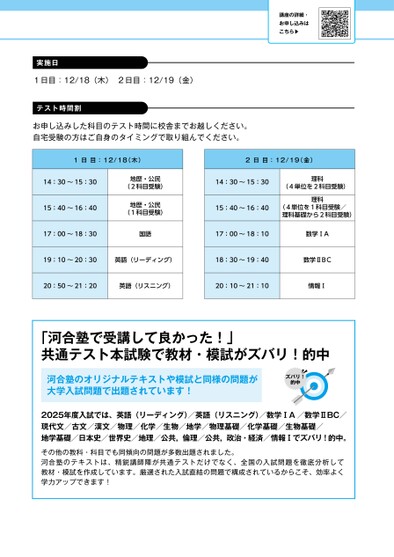 講座の詳細・お申し込みはこちら▶実施日1日目:12/18(木)2日目:12/19(金)テスト時間割お申し込みした科目のテスト時間に校舎までお越しください。自宅受験の方はご自身のタイミングで取り組んでください。1日目:12/18(木)2日目:12/19(金)14:30〜15:3015:40〜16:40地歴・公民(2科目受験)地歴・公民(1科目受験)14:30〜15:30理科(4単位を2科目受験)15:40〜16:40理科(4単位を1科目受験/理科基礎から2科目受験)17:00〜18:30国語17:00〜18:10数学ⅠA19:10〜20:30英語(リーディング)18:30〜19:40数学ⅡBC20:50〜21:20英語(リスニング)20:10〜21:10情報Ⅰ「河合塾で受講して良かった!」共通テスト本試験で教材・模試がズバリ!的中河合塾のオリジナルテキストや模試と同様の問題が大学入試問題で出題されています!ズバリ!的中2025年度入試では、英語(リーディング)/英語(リスニング)/数学ⅠA/数学ⅡBC/現代文/古文/漢文/物理/化学/生物/地学/物理基礎/化学基礎/生物基礎/地学基礎/日本史/世界史/地理/公共,倫理/公共,政治・経済/情報Ⅰでズバリ!的中。その他の教科・科目でも同傾向の問題が多数出題されました。河合塾のテキストは、精鋭講師陣が共通テストだけでなく、全国の入試問題を徹底分析して教材・模試を作成しています。厳選された入試直結の問題で構成されているからこそ、効率よく学力アップできます!