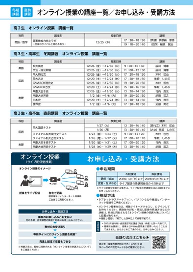 冬期講習直前講習オンライン授業の講座一覧/お申し込み・受講方法高2生オンライン授業講座一覧科目英語/数学講座名答案作成力向上ラボ-全国のライバルと高めあおう-授業日時講師12/25(木)17:20~18:5019:10~20:40(英語)胡摩﨑章秀(数学)樋原賢治高3生・高卒生冬期講習オンライン授業講座一覧科目英語国語地歴講座名私大英語文法・語法攻略早大現代文早大古文GMARCH現代文GMARCH古文早慶大日本史早慶大世界史日本史世界史授業日時12/26(金)~12/30(火)12/26(金)~12/30(火)12/26(金)~12/30(火)12/20(土)~12/24(水)12/26(金)~12/30(火)12/20(土)~12/24(水)12/26(金)~12/30(火)1/2(金)~1/6(火)12/20(土)~12/24(水)1/2(金)~1/6(火)9:00~10:3011:00~12:3017:20~18:5017:20~18:5019:20~20:5015:20~16:5013:20~14:5019:20~20:5013:20~14:5017:20~18:50講師成川博康成川博康木村哲也隼坂しのぶ木村哲也隼坂しのぶ竹内良元沼田英之竹内良元沼田英之高3生・高卒生直前講習オンライン授業講座一覧科目国語地歴講座名早大国語テストファイナル私大現代文テストファイナル私大古文テスト早慶大日本史テスト早慶大世界史テストオンライン授業(ライブ配信型授業)オンライン授業のイメージILVE授業をライブ配信自宅で受講視聴端末とインターネット環境は、ご自身でご用意ください。授業日時1/27(火)1/26(月)1/23(金)・1/24(土)1/26(月)・1/27(火)1/30(金)・1/31(土)1/28(水)・1/29(木)13:20~16:4013:20~16:409:00~12:2017:00~20:2017:00~20:2013:20~16:40講師(現代文)木村哲也(古文)隼坂しのぶ木村哲也隼坂しのぶ竹内良元沼田英之お申し込み・受講方法●申込期間冬期講習直前講習新規・追加変更・取りやめ2026/1/6(火)までライブ配信の受講開始日の4日前まで2026/2/5(木)まで※ライブ配信を受講する場合は、ライブ配信の受講開始日の4日前までにお申し込みください。●視聴方法タブレットやスマートフォン、パソコンなどの機器とインターネット環境をご準備ください。オンライン授業当日は、視聴サイトへアクセスし、ログインしてお待ちください。視聴先のURL・見逃し配信の視聴方法などの詳細は、教材に同封される「オンライン授業の受講方法について」に記載があります。※見逃し配信は「終了した講単位」で視聴可能です。2025年度冬期・直前講習同名講座(対面/映像)と同一内容です。授業担当講師に、授業当日やWeb質問書で質問いただくことはできません。あらかじめご了承のうえ、お申し込みください。注意事項受講の流れはこちら▶高2生「答案作成力向上ラボ」については5ページの二次元コードからご確認ください。お申し込み・受講方法講座のお申し込みとお支払い他の冬期・直前講習の講座と同様にお申し込みください。教材のお受け取り専用サイトにログインし講義を視聴※見逃し配信で復習もできる※視聴方法は、教材に同封される「オンライン授業の受講方法について」をご確認ください。