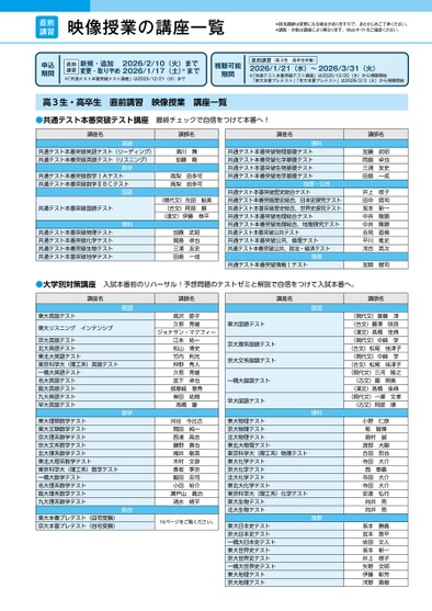 直前講習映像授業の講座一覧*担当講師は変更になる場合がありますので、あらかじめご了承ください。*講数・分数は講座により異なります。Webサイトをご確認ください。申込期間新規・追加2026/2/10(火)まで変更・取りやめ2026/1/17(土)※まで直前講習※「共通テスト本番突破テスト講座」は2025/12/21(日)まで視聴可能期間直前講習(高3生・高卒生対象)2026/1/21(水)〜2026/3/31(火)※「共通テスト本番突破テスト講座」は2025/12/25(木)から視聴開始「東大本番プレテスト」「京大本番プレテスト」は2026/2/3(火)から視聴開始高3生・高卒生直前講習映像授業講座一覧●共通テスト本番突破テスト講座最終チェックで自信をつけて本番へ!講座名共通テスト本番突破英語テスト(リーディング)共通テスト本番突破英語テスト(リスニング)共通テスト本番突破数学ⅠAテスト共通テスト本番突破数学ⅡBCテスト英語数学国語共通テスト本番突破国語テスト共通テスト本番突破物理テスト共通テスト本番突破化学テスト共通テスト本番突破生物テスト共通テスト本番突破地学テスト理科講師名清川舞加藤剛高梨由多可高梨由多可(現代文)光田鮎美(古文)阿部順(漢文)伊藤恭平加藤武昭岡島卓也三浦友史田島一成講座名理科共通テスト本番突破物理基礎テスト共通テスト本番突破化学基礎テスト共通テスト本番突破生物基礎テスト共通テスト本番突破地学基礎テスト地歴・公民共通テスト本番突破歴史総合テスト共通テスト本番突破歴史総合,日本史探究テスト共通テスト本番突破歴史総合,世界史探究テスト共通テスト本番突破地理総合テスト共通テスト本番突破地理総合,地理探究テスト共通テスト本番突破公共テスト共通テスト本番突破公共,倫理テスト共通テスト本番突破公共,政治・経済テスト共通テスト本番突破情報Ⅰテスト情報●大学別対策講座入試本番前のリハーサル!予想問題のテストゼミと解説で自信をつけて入試本番へ。講師名加藤武昭岡島卓也三浦友史田島一成井上徳子田中信司坂本新一中井隆顕中井隆顕吉見直倫平川唯史河合英次加賀健司講師名(現代文)斎藤淳(古文)藤澤咲良(漢文)髙橋佳典(現代文)中崎学(古文)松尾佳津子(現代文)中崎学(古文)松尾佳津子(現代文)三河隆之(古文)園明美(漢文)髙橋佳典(現代文)一瀬文孝(古文)阿部順小野仁彦乾雅博島村誠渡部大嗣合田哲也寺田大介西章嘉寺田大介寺田大介安達弘行向井亮向井亮坂本勝義宮本晋平依田文人坂本新一井上徳子矢野文明伊藤彰芳河野貴樹講座名英語東大英語テスト東大リスニングインテンシブ京大英語テスト北大英語テスト東北大英語テスト東京科学大(理工系)英語テスト一橋大英語テスト名大英語テスト阪大英語テスト九大英語テスト早大英語テスト東大理類数学テスト東大文類数学テスト京大理系数学テスト京大文系数学テスト北大理系数学テスト東北大理系数学テスト東京科学大(理工系)数学テスト一橋大数学テスト名大理系数学テスト阪大理系数学テスト九大理系数学テスト東大本番プレテスト(自宅受験)京大本番プレテスト(自宅受験)数学総合ジョナサン・マクフィー講師名高沢節子久恒秀雄江本祐一松山博史竹内利光仲野秀人久恒秀雄宮下卓也胡摩﨑章秀柴田祐樹髙橋慶刈谷今比古岡田純一西浦高志藤野真也福井敏英木村文彦香坂季京飯田忠司小田裕介瀬戸山義治清水脩平16ページをご覧ください。講座名国語東大国語テスト京大理系国語テスト京大文系国語テスト一橋大国語テスト早大国語テスト理科地歴東大物理テスト京大物理テスト北大物理テスト東北大物理テスト東京科学大(理工系)物理テスト東大化学テスト京大化学テスト北大化学テスト東北大化学テスト東京科学大(理工系)化学テスト東大生物テスト北大生物テスト東大日本史テスト京大日本史テスト一橋大日本史テスト東大世界史テスト京大世界史テスト一橋大世界史テスト東大地理テスト京大地理テスト