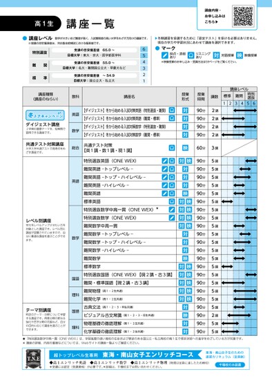 ▶冬期講習を受講するために「認定テスト」を受ける必要はありません。現在の学力や学習状況にあわせて講座を選択できます。●マーク採点・添削ありリスニングあり対対面授業映映像授業*映像授業のお申し込み・受講方法は59ページをご覧ください。563412特別選抜難関標準受講の目安偏差値65.0〜目標大学:東大・京大・医学部医学科受講の目安偏差値55.0〜目標大学:名大・難関国公立大・早慶大など受講の目安偏差値〜54.9目標大学:国公立大・私立大●講座レベル※受講の目安偏差値は、河合塾全統模試における偏差値です。数字が大きいほど難度が高く、入試難易度の高い大学をめざす方向けの講座です。講座種類(講座のねらい)冬トクキャンペーンダイジェスト講座2学期の重要テーマを、短期間で習得できる講座です。共通テスト対策講座大学入学共通テストで高得点をめざす講座です。レベル別講座学力をレベルアップさせたい方を対象とした講座です。レベル別に講座が設置されていますので、自分に最適な講座を選ぶことができます。テーマ別講座特定のテーマ・分野について学習する講座です。得意分野の更なる強化や苦手分野の克服など、自分の目的に応じて講座を選ぶことができます。教科英語数学総合英語数学国語理科国語理科講座名【ダイジェスト】冬から始める入試対策英語(特別選抜・難関)【ダイジェスト】冬から始める入試対策英語(難関・標準)【ダイジェスト】冬から始める入試対策数学(特別選抜・難関)【ダイジェスト】冬から始める入試対策数学(難関・標準)共通テスト対策【英1講・数1講・現1講】特別選抜英語(ONEWEX)難関英語―トップレベル―難関英語―トップ・ハイレベル―難関英語―ハイレベル―難関英語標準英語特別選抜数学中高一貫(ONEWEX)★特別選抜数学(ONEWEX)難関数学中高一貫難関数学―トップレベル―難関数学―トップ・ハイレベル―難関数学―ハイレベル―難関数学標準数学特別選抜国語(ONEWEX)【現2講・古3講】難関・標準国語【現2講・古3講】難関物理(高1・2生共通)難関化学(高1・2生共通)古典文法(高1・2・3・卒生共通)ビジュアル古文常識(高1・2・3・卒生共通)物理基礎の徹底理解(高1・2生共通)化学基礎の徹底理解(高1・2生共通)講座レベル標準12難関34特別選抜56授業形式対対対対映対映対対対映対映対映対映対映対対対映対映対映対映対映対映対映対対授業時間90分90分90分90分講数2講2講2講2講60分3講90分90分90分90分90分90分90分90分90分90分90分90分90分90分90分90分90分90分90分90分90分90分5講5講5講5講5講5講5講5講5講5講5講5講5講5講5講5講5講5講5講2講5講5講★「特別選抜数学中高一貫(ONEWEX)」は、学習進度の速い高校の生徒および意欲のある国公立・私立高校の高1生で理系学部への進学をめざしている方が対象です。*講座の詳細、内容の重複などについては、Webサイトの講座一覧よりご確認ください。超トップレベル生専用東海・南山女子エンリッチコース東海・南山女子生のための速習カリキュラム(定員制)◆高1エンリッチ英語◆高1エンリッチ数学◆高1エンリッチ物理〈物理は定員に達したため締切〉*受講には認定(受講資格)が必要です。*詳細は、千種校までお問い合わせください。千種校のみ設置高1生講座一覧講座内容・お申し込みはこちら▶