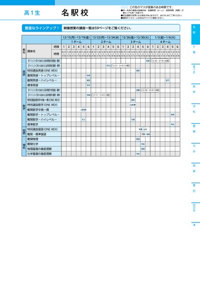 名駅千種星ヶ丘岐阜浜松豊橋刈谷岡崎豊田四日市津12/15(月)~12/19(金)12/22(月)~12/24(水)12/26(金)~12/30(火)1/2(金)~1/6(火)1ターム2ターム3ターム4ターム12345612345612345612345609:10〜10:4011:00〜12:3013:40〜15:1015:30〜17:0017:20〜18:5019:10〜20:4009:10〜10:4011:00〜12:3013:40〜15:1015:30〜17:0017:20〜18:5019:10〜20:4009:10〜10:4011:00〜12:3013:40〜15:1015:30〜17:0017:20〜18:5019:10〜20:4009:10〜10:4011:00〜12:3013:40〜15:1015:30〜17:0017:20〜18:5019:10〜20:40松延12/26・27の2日間市位12/23・24の2日間室田松岡塚田笠井笠岡12/15・16の2日間山田(龍)大上宮下笠岡河合加藤12/28・29の2日間高田山田(勝)大庭高橋・山村平野・笹森西浦花田花田西浦時限時間講座名教科【ダイジェスト】冬から始める入試対策英語(特別選抜・難関)【ダイジェスト】冬から始める入試対策英語(難関・標準)特別選抜英語(ONEWEX)難関英語-トップレベル-難関英語-ハイレベル-標準英語【ダイジェスト】冬から始める入試対策数学(特別選抜・難関)【ダイジェスト】冬から始める入試対策数学(難関・標準)特別選抜数学中高一貫(ONEWEX)特別選抜数学(ONEWEX)難関数学中高一貫難関数学-トップレベル-難関数学-ハイレベル-標準数学特別選抜国語(ONEWEX)難関・標準国語難関物理難関化学物理基礎の徹底理解化学基礎の徹底理解英語数学国語理科豊富なラインアップ!映像授業の講座一覧は59ページをご覧ください。●2025年度/冬期講習/中部/名駅校/高1生/パターン14452025_57_4_414_31_20250710154549.csv/1ページ校了時削除高1生名駅校この色のマスが授業のある時限です。●同一名称の講座は設置校舎・設置期間(ターム)・授業時間(時限)が異なっても同一内容です。●担当講師は変更になる場合がありますので、あらかじめご了承ください。●講師のフルネームはWebサイトでご確認ください。