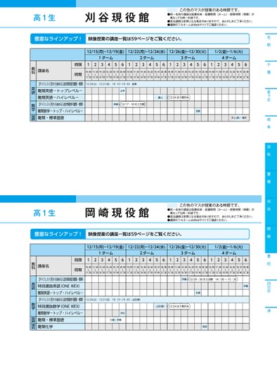 名駅千種星ヶ丘岐阜浜松豊橋刈谷岡崎豊田四日市津12/15(月)~12/19(金)12/22(月)~12/24(水)12/26(金)~12/30(火)1/2(金)~1/6(火)1ターム2ターム3ターム4ターム12345612345612345612345610:00〜11:3011:50〜13:2014:30〜16:0016:20〜17:5018:10〜19:4020:00〜21:3010:00〜11:3011:50〜13:2014:30〜16:0016:20〜17:5018:10〜19:4020:00〜21:3010:00〜11:3011:50〜13:2014:30〜16:0016:20〜17:5018:10〜19:4020:00〜21:3010:00〜11:3011:50〜13:2014:30〜16:0016:20〜17:5018:10〜19:4020:00〜21:30時限時間講座名【ダイジェスト】冬から始める入試対策英語(難関・標準)難関英語-トップレベル-難関英語-ハイレベル-【ダイジェスト】冬から始める入試対策数学(難関・標準)難関数学-トップ・ハイレベル-難関・標準国語12/20(土)・12/21(日)18:10〜19:40長瀬山本斉藤12/17・18の2日間盧山12/24は5限のみ吉嗣井上(真)・横井教科英語数学国語豊富なラインアップ!映像授業の講座一覧は59ページをご覧ください。高1生岡崎現役館この色のマスが授業のある時限です。●同一名称の講座は設置校舎・設置期間(ターム)・授業時間(時限)が異なっても同一内容です。●担当講師は変更になる場合がありますので、あらかじめご了承ください。●講師のフルネームはWebサイトでご確認ください。12/15(月)~12/19(金)12/22(月)~12/24(水)12/26(金)~12/30(火)1/2(金)~1/6(火)1ターム2ターム3ターム4ターム12345612345612345612345610:00〜11:3011:50〜13:2014:30〜16:0016:20〜17:5018:10〜19:4020:00〜21:3010:00〜11:3011:50〜13:2014:30〜16:0016:20〜17:5018:10〜19:4020:00〜21:3010:00〜11:3011:50〜13:2014:30〜16:0016:20〜17:5018:10〜19:4020:00〜21:3010:00〜11:3011:50〜13:2014:30〜16:0016:20〜17:5018:10〜19:4020:00〜21:30時限時間講座名【ダイジェスト】冬から始める入試対策英語(難関・標準)特別選抜英語(ONEWEX)難関英語-トップ・ハイレベル-【ダイジェスト】冬から始める入試対策数学(難関・標準)特別選抜数学(ONEWEX)難関数学-トップ・ハイレベル-難関・標準国語難関化学伊藤12/29・30の2日間14:00~15:30伊藤12/20(土)・12/21(日)18:10〜19:40山田(勝)山田(勝)12/24は5限のみ河合日嵩・伊藤永瀬若原教科英語数学国語理科豊富なラインアップ!映像授業の講座一覧は59ページをご覧ください。●2025年度/冬期講習/中部/刈谷/高1生/パターン14452025_57_4_448_31_20250707121121.csv/1ページ校了時削除高1生刈谷現役館この色のマスが授業のある時限です。●同一名称の講座は設置校舎・設置期間(ターム)・授業時間(時限)が異なっても同一内容です。●担当講師は変更になる場合がありますので、あらかじめご了承ください。●講師のフルネームはWebサイトでご確認ください。