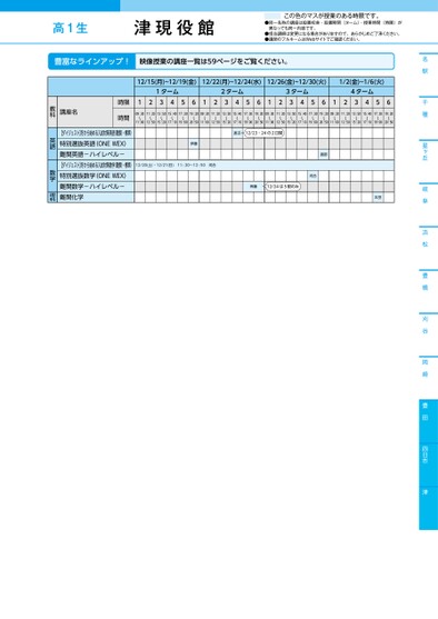 名駅千種星ヶ丘岐阜浜松豊橋刈谷岡崎豊田四日市津12/15(月)~12/19(金)12/22(月)~12/24(水)12/26(金)~12/30(火)1/2(金)~1/6(火)1ターム2ターム3ターム4ターム12345612345612345612345609:30〜11:0011:20〜12:5013:50〜15:2015:40〜17:1017:30〜19:0019:20〜20:5009:30〜11:0011:20〜12:5013:50〜15:2015:40〜17:1017:30〜19:0019:20〜20:5009:30〜11:0011:20〜12:5013:50〜15:2015:40〜17:1017:30〜19:0019:20〜20:5009:30〜11:0011:20〜12:5013:50〜15:2015:40〜17:1017:30〜19:0019:20〜20:50時限時間講座名【ダイジェスト】冬から始める入試対策英語(難関・標準)特別選抜英語(ONEWEX)難関英語-ハイレベル-【ダイジェスト】冬から始める入試対策数学(難関・標準)特別選抜数学(ONEWEX)難関数学-ハイレベル-難関化学渡辺12/23・24の2日間伊藤12/20(土)・12/21(日)11:20〜12:50河合渡部河合斉藤12/24は5限のみ太田教科英語数学理科豊富なラインアップ!映像授業の講座一覧は59ページをご覧ください。●2025年度/冬期講習/中部/津/高1生/パターン14452025_57_4_432_31_20250710114436.csv/1ページ校了時削除高1生津現役館この色のマスが授業のある時限です。●同一名称の講座は設置校舎・設置期間(ターム)・授業時間(時限)が異なっても同一内容です。●担当講師は変更になる場合がありますので、あらかじめご了承ください。●講師のフルネームはWebサイトでご確認ください。