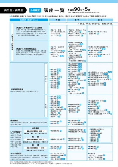 高3生・高卒生冬期講習講座一覧1講座90分×5講※形式(授業分数または講数)の異なる講座もあります。▶冬期講習を受講するために「認定テスト」を受ける必要はありません。現在の学力や学習状況にあわせて講座を選択できます。講座種類(講座のねらい)英語数学国語6教科型、または3教科型のセット受講がお得です。医進講座ハイレベルな内容に取り組み、医学部医学科の合格に必要な学力を養成します。●名大医進英語対●医進英語対●名大医進数学対●トップレベル医進数学対●ハイレベル医進数学対レベル別講座※1学力をレベルアップさせたい方を対象とした講座です。レベル別に講座が設置されていますので、自分に最適な講座を選ぶことができます。特別選抜受講の目安偏差値65.0~目標大学:東大・京大・医学部医学科●特別選抜英語対難関受講の目安偏差値55.0~●難関国公立大英語対目標大学:名大・難関国公立大・早慶大など●特別選抜理系数学ⅢC対●特別選抜数学ⅠAⅡBC対●難関理系数学ⅢC対●難関数学ⅠAⅡBC対●難関国公立大現代文(論述対策)対●難関国公立大古文(論述対策)対●難関現代文対●難関古文対●難関漢文対標準受講の目安偏差値~54.9目標大学:国公立大・私立大●国公立大英語対●私大英語対オ●標準理系数学ⅢC対●標準数学ⅠAⅡBC対●標準現代文対●標準古文対テーマ別講座特定のテーマ・分野について学習する講座です。得意分野の更なる強化や苦手分野の克服など、自分の目的に応じて講座を選ぶことができます。●トップ・ハイレベル超長文英語読解(私大編)対●自由英作文対●文法・語法攻略対オ●古典文法(高1・2・3・卒生共通)対●ビジュアル古文常識(高1・2・3・卒生共通)映※1レベル別講座の受講目安偏差値は、河合塾全統模試における偏差値です。※2「共通テスト傾向対策情報Ⅰテスト」は、2025年度夏期講習の「共通テスト対策情報Ⅰ」と同一内容です。●共通テスト本番(リーディング・リハーサル英語テストリスニング)映●共通テスト本番リハーサル数学ⅠAテスト映●共通テスト本番リハーサル数学ⅡBCテスト映●共通テスト本番リハーサル国語テスト映●共通テスト傾向対策英語テスト(リーディング)対映●共通テスト傾向対策英語テスト(リスニング)対映●共通テスト傾向対策数学ⅠAテスト対映●共通テスト傾向対策数学テスト(ⅡB+ベクトル型)対映●共通テスト傾向対策数学テスト(統計的な推測)映●共通テスト傾向対策数学テスト(平面上の曲線と複素数平面)映●共通テスト傾向対策国語テスト【現3講・古1講・漢1講】対映●共通テスト傾向対策現代文テスト対映●共通テスト傾向対策古典テスト【古3講・漢2講】対映●東大英語対映●京大英語対映●北大英語映●東京科学大(理工系)英語対●一橋大英語対●名大英語対●名工大英語対●名市大英語対●阪大英語対●神大英語対●東大理類数学対映●東大文類数学対映●京大理系数学対映●京大文系数学対映●北大理系数学映●北大数学(ⅡB+ベクトル型)映●東京科学大(理工系)数学対●一橋大数学対●名大理系数学対●名大数学(ⅡB+ベクトル型)対●名工大数学対●阪大理系数学対●阪大数学(ⅡB+ベクトル型)対●神大理系数学対●神大数学(ⅡB+ベクトル型)対●早大英語対映●慶大英語対映●明治・中央・法政大英語対●南山大英語対●名城大英語対●関学・関大英語対●同志社・立命館大英語対●愛知医科大(医)英語テスト対●藤田医科大(医)英語テスト対●早慶大理工数学対●愛知医科大(医)数学テスト対●藤田医科大(医)数学テスト対●東大国語【現2講・古2講・漢1講】対映●京大国語【現3講・古2講】対映●京大理系国語【現3講・古2講】対●京大文系国語【現3講・古2講】対●一橋大国語【現3講・古1講・漢1講】対●名大現代文対●名大古典【古3講・漢2講】対●阪大国語【現3講・古2講】対●早大国語【現3講・古2講】対●早大現代文オ●早大古文オ●GMARCH現代文オ●GMARCH古文オ●南山大国語【現3講・古2講】対●関学・関大国語【現3講・古2講】対●同志社・立命館大国語【現3講・古2講】対共通テスト本番リハーサル講座共通テスト本番と同一時間で予想問題にチャレンジ!テスト実施後の解説講義(映像)では、現時点での学力を確認することで、目前の共通テスト対策学習の目標を明確にします。共通テスト傾向対策講座共通テストの予想問題演習や差のつく分野の徹底攻略を行います。この冬で共通テスト対策の総仕上げを行いたい受験生に最適の講座です。共通テスト対策講座国公立大私立大大学別対策講座各大学の出題傾向を踏まえた対策を行います。