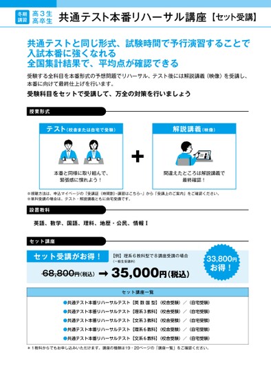 冬期講習高3生高卒生共通テスト本番リハーサル講座【セット受講】共通テストと同じ形式、試験時間で予行演習することで入試本番に強くなれる全国集計結果で、平均点が確認できる受験する全科目を本番形式の予想問題でリハーサル、テスト後には解説講義(映像)を受講し、本番に向けて最終仕上げを行います。受験科目をセットで受講して、万全の対策を行いましょう授業形式テスト(校舎または自宅で受験)解説講義(映像)本番と同様に取り組んで、緊張感に慣れよう!間違えたところは解説講義で最終確認!※視聴方法は、申込マイページの「受講証(時間割)ー講習はこちらー」から「受講上のご案内」をご確認ください。※単科受講の場合は、テスト・解説講義ともに自宅受講です。設置教科英語、数学、国語、理科、地歴・公民、情報Ⅰセット講座セット受講がお得!68,800円(税込)【例】理系6教科型で8講座受講の場合(一般生受講料)35,000円(税込)33,800円お得!セット講座一覧●共通テスト本番リハーサルテスト【英数国型】(校舎受験)/(自宅受験)●共通テスト本番リハーサルテスト【理系3教科】(校舎受験)/(自宅受験)●共通テスト本番リハーサルテスト【文系3教科】(校舎受験)/(自宅受験)●共通テスト本番リハーサルテスト【理系6教科】(校舎受験)/(自宅受験)●共通テスト本番リハーサルテスト【文系6教科】(校舎受験)/(自宅受験)*1教科からでもお申し込みいただけます。講座の種類は19・20ページの「講座一覧」をご確認ください。