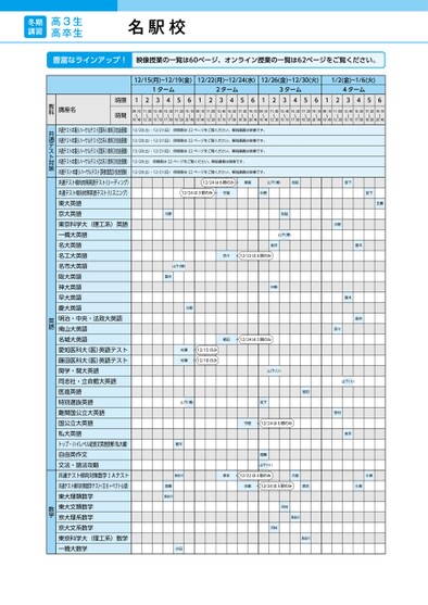 12/15(月)~12/19(金)12/22(月)~12/24(水)12/26(金)~12/30(火)1/2(金)~1/6(火)1ターム2ターム3ターム4ターム12345612345612345612345609:1011:0013:4015:3017:2019:1009:1011:0013:4015:3017:2019:1009:1011:0013:4015:3017:2019:1009:1011:0013:4015:3017:2019:1010:4012:3015:1017:0018:5020:4010:4012:3015:1017:0018:5020:4010:4012:3015:1017:0018:5020:4010:4012:3015:1017:0018:5020:4012/20(土)・12/21(日)時間割は22ページをご覧ください。解説講義は映像です。12/20(土)・12/21(日)時間割は22ページをご覧ください。解説講義は映像です。12/20(土)・12/21(日)時間割は22ページをご覧ください。解説講義は映像です。12/20(土)時間割は22ページをご覧ください。解説講義は映像です。12/20(土)・12/21(日)時間割は22ページをご覧ください。解説講義は映像です。12/24は6限のみ塚越山下(博)延松下宮12/24は3限のみ屋守野中下宮玉置延松山下(博)井金百々12/22は4限のみ中野野川山下(博)登木川野植田12/24は3限のみ村瀬村瀬12/15のみ12/18のみ山下(り)室田山下(博)宮下川野木登登木金井百々山下(り)笹村金井守屋12/24は6限のみ遠藤山下(り)本森12/22は4限のみ庭大嶋水12/24は5限のみ本森倉小倉小河村長谷川河村長谷川藤加長谷川登木長谷川小田講座名時限時間共通テスト本番リハーサルテスト【理系6教科】校舎受験)共通テスト本番リハーサルテスト【文系6教科】校舎受験)共通テスト本番リハーサルテスト【理系3教科】校舎受験)共通テスト本番リハーサルテスト【文系3教科】校舎受験)共通テスト本番リハーサルテスト【英数国型】校舎受験)共通テスト傾向対策英語テスト(リーディング)共通テスト傾向対策英語テスト(リスニング)東大英語京大英語東京科学大(理工系)英語一橋大英語名大英語名工大英語名市大英語阪大英語神大英語早大英語慶大英語明治・中央・法政大英語南山大英語名城大英語愛知医科大(医)英語テスト藤田医科大(医)英語テスト関学・関大英語同志社・立命館大英語医進英語特別選抜英語難関国公立大英語国公立大英語私大英語トップ・ハイレベル超長文英語読解(私大編)自由英作文文法・語法攻略共通テスト傾向対策数学ⅠAテスト共通テスト傾向対策数学テスト(ⅡB+ベクトル型)東大理類数学東大文類数学京大理系数学京大文系数学東京科学大(理工系)数学一橋大数学教科共通テスト対策英語数学冬期講習高3生高卒生名駅校豊富なラインアップ!映像授業の一覧は60ページ、オンライン授業の一覧は62ページをご覧ください。
