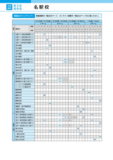 豊富なラインアップ!映像授業の一覧は60ページ、オンライン授業の一覧は62ページをご覧ください。12/15(月)~12/19(金)12/22(月)~12/24(水)12/26(金)~12/30(火)1/2(金)~1/6(火)1ターム2ターム3ターム4ターム12345612345612345612345609:10〜10:4011:00〜12:3013:40〜15:1015:30〜17:0017:20〜18:5019:10〜20:4009:10〜10:4011:00〜12:3013:40〜15:1015:30〜17:0017:20〜18:5019:10〜20:4009:10〜10:4011:00〜12:3013:40〜15:1015:30〜17:0017:20〜18:5019:10〜20:4009:10〜10:4011:00〜12:3013:40〜15:1015:30〜17:0017:20〜18:5019:10〜20:40時限時間講座名教科冬期講習高3生高卒生名駅校12/24は5限のみ齋藤太田中村1/2~4の3日間田中西浦西浦12/22のみ12/23のみ大宮大宮12/22のみ12/23のみ瀬木坂本西浦岸花田坂本青野村松福井岸坂本大髙大髙桝元宮地齋藤齋藤村山12/24は3限のみ堤12/24は5限のみ平松松本小池12/24は3限のみ日髙12/24は3限のみ平野平野日髙中垣小山榊原吉見中垣岸花田太田平野松本村松花田酒井共通テスト傾向対策物理テスト共通テスト傾向対策化学テスト共通テスト傾向対策生物テスト共通テスト傾向対策化学基礎テスト東大物理京大物理東京科学大(理工系)物理名大物理阪大物理愛知医科大(医)物理テスト藤田医科大(医)物理テスト東大化学京大化学東京科学大(理工系)化学名大化学阪大化学愛知医科大(医)化学テスト藤田医科大(医)化学テストトップレベル医進物理トップレベル医進化学難関物理標準物理難関化学標準化学難関生物標準生物電磁気・原子物理完成有機化学完成理論化学完成共通テスト傾向対策歴史総合,日本史探究テスト共通テスト傾向対策歴史総合,世界史探究テスト共通テスト傾向対策地理総合,地理探究テスト共通テスト傾向対策公共,倫理テスト共通テスト傾向対策公共,政治・経済テスト東大日本史京大日本史一橋大日本史早慶大日本史南山大日本史理科地歴・公民●2025年度/冬期講習/中部/名駅校/高3・卒生/パターン14452025_57_4_414_11_20250710171233.csv/3ページ校了時削除