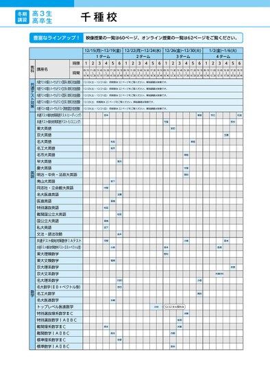 12/15(月)~12/19(金)12/22(月)~12/24(水)12/26(金)~12/30(火)1/2(金)~1/6(火)1ターム2ターム3ターム4ターム12345612345612345612345609:1011:0013:4015:3017:2019:1009:1011:0013:4015:3017:2019:1009:1011:0013:4015:3017:2019:1009:1011:0013:4015:3017:2019:1010:4012:3015:1017:0018:5020:4010:4012:3015:1017:0018:5020:4010:4012:3015:1017:0018:5020:4010:4012:3015:1017:0018:5020:4012/20(土)・12/21(日)時間割は22ページをご覧ください。解説講義は映像です。12/20(土)・12/21(日)時間割は22ページをご覧ください。解説講義は映像です。12/20(土)・12/21(日)時間割は22ページをご覧ください。解説講義は映像です。12/20(土)時間割は22ページをご覧ください。解説講義は映像です。12/20(土)・12/21(日)時間割は22ページをご覧ください。解説講義は映像です。宮本中野松延塚越宮下市野松延金井宮下塚越倉小福眞水嶋落合玉置松延金井三田村宮田本森本森市野越塚位市延松村笹玉置屋守室田塚越塚越守屋塚田倉小本森野村小田12/22は6限のみ水嶋笠岡嶋水野市森本本森畑西市野村瀬(宗)小倉高田講座名時限時間共通テスト本番リハーサルテスト【理系6教科】校舎受験)共通テスト本番リハーサルテスト【文系6教科】校舎受験)共通テスト本番リハーサルテスト【理系3教科】校舎受験)共通テスト本番リハーサルテスト【文系3教科】校舎受験)共通テスト本番リハーサルテスト【英数国型】校舎受験)共通テスト傾向対策英語テスト(リーディング)共通テスト傾向対策英語テスト(リスニング)東大英語京大英語名大英語名工大英語名市大英語早大英語慶大英語明治・中央・法政大英語南山大英語同志社・立命館大英語名大医進英語医進英語特別選抜英語難関国公立大英語国公立大英語私大英語文法・語法攻略共通テスト傾向対策数学ⅠAテスト共通テスト傾向対策数学テスト(ⅡB+ベクトル型)東大理類数学東大文類数学京大理系数学京大文系数学名大理系数学名大数学(ⅡB+ベクトル型)名工大数学名大医進数学トップレベル医進数学特別選抜理系数学ⅢC特別選抜数学ⅠAⅡBC難関理系数学ⅢC難関数学ⅠAⅡBC標準理系数学ⅢC標準数学ⅠAⅡBC教科共通テスト対策英語数学冬期講習高3生高卒生千種校豊富なラインアップ!映像授業の一覧は60ページ、オンライン授業の一覧は62ページをご覧ください。