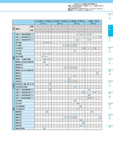 この色のマスが授業のある時限です。●同一名称の講座は設置校舎・設置期間(ターム)・授業時間(時限)が異なっても同一内容です。●担当講師は変更になる場合がありますので、あらかじめご了承ください。●講師のフルネームはWebサイトでご確認ください。名駅千種星ヶ丘岐阜浜松豊橋刈谷岡崎豊田四日市津12/15(月)~12/19(金)12/22(月)~12/24(水)12/26(金)~12/30(火)1/2(金)~1/6(火)1ターム2ターム3ターム4ターム12345612345612345612345609:10〜10:4011:00〜12:3013:40〜15:1015:30〜17:0017:20〜18:5019:10〜20:4009:10〜10:4011:00〜12:3013:40〜15:1015:30〜17:0017:20〜18:5019:10〜20:4009:10〜10:4011:00〜12:3013:40〜15:1015:30〜17:0017:20〜18:5019:10〜20:4009:10〜10:4011:00〜12:3013:40〜15:1015:30〜17:0017:20〜18:5019:10〜20:40時限時間講座名教科安達・井上(摩)・野村平野・鈴木(孝)井上(摩)・江大田・野村高橋武下・井上(摩)12/24は5限のみ高橋12/28~30の3日間坂下・江高橋12/24は5限のみ横井江山村12/22は6限のみ坂下坂下日髙村松岸青野坂本高森若原1/2~4の3日間高森青野大髙窪田坂本大髙12/24は5限のみ大宮青野福井福井武下・井上(摩)・野村武下・井上(摩)日嵩・井上(摩)齊藤・井上(摩)福永福永大田窪田窪田田中共通テスト傾向対策国語テスト共通テスト傾向対策現代文テスト共通テスト傾向対策古典テスト東大国語京大国語名大現代文名大古典早大国語南山大国語同志社・立命館大国語難関国公立大現代文(論述対策)難関現代文標準現代文難関国公立大古文(論述対策)難関古文標準古文難関漢文古典文法医系小論文(医・看護・保健・歯・薬)社会科学系小論文共通テスト傾向対策物理テスト共通テスト傾向対策化学テスト共通テスト傾向対策生物テスト共通テスト傾向対策生物基礎テスト名大物理名大化学名大医進物理名大医進化学難関物理標準物理難関化学標準化学難関生物標準生物有機化学完成国語小論文理科●2025年度/冬期講習/中部/千種/高3・卒生/パターン14452025_57_4_413_11_20250710171233.csv/2ページ校了時削除