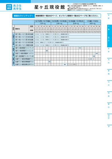 名駅千種星ヶ丘岐阜浜松豊橋刈谷岡崎豊田四日市津豊富なラインアップ!映像授業の一覧は60ページ、オンライン授業の一覧は62ページをご覧ください。12/15(月)~12/19(金)12/22(月)~12/24(水)12/26(金)~12/30(火)1/2(金)~1/6(火)1ターム2ターム3ターム4ターム12345612345612345612345609:1011:0013:4015:3017:2019:1009:1011:0013:4015:3017:2019:1009:1011:0013:4015:3017:2019:1009:1011:0013:4015:3017:2019:1010:4012:3015:1017:0018:5020:4010:4012:3015:1017:0018:5020:4010:4012:3015:1017:0018:5020:4010:4012:3015:1017:0018:5020:4012/20(土)・12/21(日)時間割は22ページをご覧ください。解説講義は映像です。12/20(土)・12/21(日)時間割は22ページをご覧ください。解説講義は映像です。12/20(土)・12/21(日)時間割は22ページをご覧ください。解説講義は映像です。12/20(土)時間割は22ページをご覧ください。解説講義は映像です。12/20(土)・12/21(日)時間割は22ページをご覧ください。解説講義は映像です。渡部荒木笹村水嶋水嶋井上(真)・江青野12/24は5限のみ講座名時限時間共通テスト本番リハーサルテスト【理系6教科】校舎受験)共通テスト本番リハーサルテスト【文系6教科】校舎受験)共通テスト本番リハーサルテスト【理系3教科】校舎受験)共通テスト本番リハーサルテスト【文系3教科】校舎受験)共通テスト本番リハーサルテスト【英数国型】校舎受験)共通テスト傾向対策英語テスト(リーディング)共通テスト傾向対策英語テスト(リスニング)共通テスト傾向対策数学ⅠAテスト共通テスト傾向対策数学テスト(ⅡB+ベクトル型)共通テスト傾向対策国語テスト共通テスト傾向対策物理テスト共通テスト傾向対策化学テスト教科共通テスト対策英語数学国語理科冬期講習高3生高卒生星ヶ丘現役館この色のマスが授業のある時限です。●同一名称の講座は設置校舎・設置期間(ターム)・授業時間(時限)が異なっても同一内容です。●担当講師は変更になる場合がありますので、あらかじめご了承ください。●講師のフルネームはWebサイトでご確認ください。