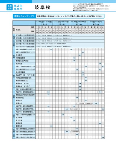 冬期講習高3生高卒生岐阜校この色のマスが授業のある時限です。●同一名称の講座は設置校舎・設置期間(ターム)・授業時間(時限)が異なっても同一内容です。●担当講師は変更になる場合がありますので、あらかじめご了承ください。●講師のフルネームはWebサイトでご確認ください。豊富なラインアップ!映像授業の一覧は60ページ、オンライン授業の一覧は62ページをご覧ください。12/15(月)~12/19(金)12/22(月)~12/24(水)12/26(金)~12/30(火)1/2(金)~1/6(火)1ターム2ターム3ターム4ターム12345612345612345612345609:1011:0013:4015:3017:2019:1009:1011:0013:4015:3017:2019:1009:1011:0013:4015:3017:2019:1009:1011:0013:4015:3017:2019:1010:4012:3015:1017:0018:5020:4010:4012:3015:1017:0018:5020:4010:4012:3015:1017:0018:5020:4010:4012:3015:1017:0018:5020:4012/20(土)・12/21(日)時間割は22ページをご覧ください。解説講義は映像です。12/20(土)・12/21(日)時間割は22ページをご覧ください。解説講義は映像です。12/20(土)・12/21(日)時間割は22ページをご覧ください。解説講義は映像です。12/20(土)時間割は22ページをご覧ください。解説講義は映像です。12/20(土)・12/21(日)時間割は22ページをご覧ください。解説講義は映像です。田室野川百々百々市位川野田小笠岡小栗小栗高原齊藤佐藤栗小西畑笠岡大田1/2~4の3日間、1/2は4限のみ伊藤山小太田12/24は5限のみ太田小山花田中垣堀井12/24は5限のみ松本山田口谷口谷鈴木(孝)・野村坂本若原日髙笹森・江石川浦西榊原若原講座名時限時間共通テスト本番リハーサルテスト【理系6教科】校舎受験)共通テスト本番リハーサルテスト【文系6教科】校舎受験)共通テスト本番リハーサルテスト【理系3教科】校舎受験)共通テスト本番リハーサルテスト【文系3教科】校舎受験)共通テスト本番リハーサルテスト【英数国型】校舎受験)共通テスト傾向対策英語テスト(リーディング)共通テスト傾向対策英語テスト(リスニング)名大英語特別選抜英語難関国公立大英語私大英語共通テスト傾向対策数学ⅠAテスト共通テスト傾向対策数学テスト(ⅡB+ベクトル型)名大理系数学名大数学(ⅡB+ベクトル型)特別選抜理系数学ⅢC難関理系数学ⅢC難関数学ⅠAⅡBC標準数学ⅠAⅡBC共通テスト傾向対策現代文テスト共通テスト傾向対策古典テスト難関国公立大現代文(論述対策)難関現代文難関古文標準古文共通テスト傾向対策物理テスト共通テスト傾向対策化学テスト共通テスト傾向対策生物テスト共通テスト傾向対策化学基礎テスト名大物理名大化学難関物理難関化学共通テスト傾向対策歴史総合,日本史探究テスト共通テスト傾向対策歴史総合,世界史探究テスト共通テスト傾向対策地理総合,地理探究テスト共通テスト傾向対策公共,政治・経済テスト教科共通テスト対策英語数学国語理科地歴・公民