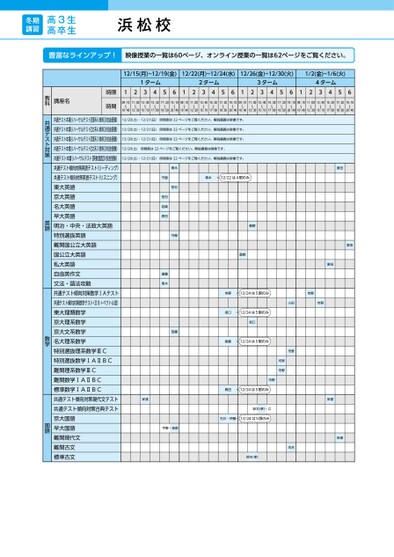 12/15(月)~12/19(金)12/22(月)~12/24(水)12/26(金)~12/30(火)1/2(金)~1/6(火)1ターム2ターム3ターム4ターム12345612345612345612345609:1011:0013:4015:3017:2019:1009:1011:0013:4015:3017:2019:1009:1011:0013:4015:3017:2019:1009:1011:0013:4015:3017:2019:1010:4012:3015:1017:0018:5020:4010:4012:3015:1017:0018:5020:4010:4012:3015:1017:0018:5020:4010:4012:3015:1017:0018:5020:4012/20(土)・12/21(日)時間割は22ページをご覧ください。解説講義は映像です。12/20(土)・12/21(日)時間割は22ページをご覧ください。解説講義は映像です。12/20(土)・12/21(日)時間割は22ページをご覧ください。解説講義は映像です。12/20(土)時間割は22ページをご覧ください。解説講義は映像です。12/20(土)・12/21(日)時間割は22ページをご覧ください。解説講義は映像です。青木笹村守屋屋守笹村岩崎原田遠藤青木木青12/22は4限のみ原田桑野桑野室田原田野市12/24は5限のみ野市小田市野坂口12/24は5限のみ坂口後藤12/24は5限のみ市野河原市野市野安達平野・笹森高田12/24は5限のみ鈴木(孝)・江石川・伊藤12/24は5限のみ安達安達河合鈴木(孝)講座名時限時間共通テスト本番リハーサルテスト【理系6教科】校舎受験)共通テスト本番リハーサルテスト【文系6教科】校舎受験)共通テスト本番リハーサルテスト【理系3教科】校舎受験)共通テスト本番リハーサルテスト【文系3教科】校舎受験)共通テスト本番リハーサルテスト【英数国型】校舎受験)共通テスト傾向対策英語テスト(リーディング)共通テスト傾向対策英語テスト(リスニング)東大英語京大英語名大英語早大英語明治・中央・法政大英語特別選抜英語難関国公立大英語国公立大英語私大英語自由英作文文法・語法攻略共通テスト傾向対策数学ⅠAテスト共通テスト傾向対策数学テスト(ⅡB+ベクトル型)東大理類数学京大理系数学京大文系数学名大理系数学特別選抜理系数学ⅢC特別選抜数学ⅠAⅡBC難関理系数学ⅢC難関数学ⅠAⅡBC標準数学ⅠAⅡBC共通テスト傾向対策現代文テスト共通テスト傾向対策古典テスト京大国語早大国語難関現代文難関古文標準古文教科共通テスト対策英語数学国語冬期講習高3生高卒生浜松校豊富なラインアップ!映像授業の一覧は60ページ、オンライン授業の一覧は62ページをご覧ください。