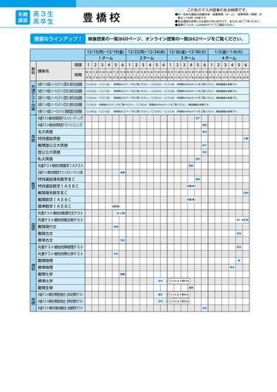 冬期講習高3生高卒生豊橋校この色のマスが授業のある時限です。●同一名称の講座は設置校舎・設置期間(ターム)・授業時間(時限)が異なっても同一内容です。●担当講師は変更になる場合がありますので、あらかじめご了承ください。●講師のフルネームはWebサイトでご確認ください。豊富なラインアップ!映像授業の一覧は60ページ、オンライン授業の一覧は62ページをご覧ください。12/15(月)~12/19(金)12/22(月)~12/24(水)12/26(金)~12/30(火)1/2(金)~1/6(火)1ターム2ターム3ターム4ターム12345612345612345612345609:1011:0013:4015:3017:2019:1009:1011:0013:4015:3017:2019:1009:1011:0013:4015:3017:2019:1009:1011:0013:4015:3017:2019:1010:4012:3015:1017:0018:5020:4010:4012:3015:1017:0018:5020:4010:4012:3015:1017:0018:5020:4010:4012:3015:1017:0018:5020:4012/20(土)・12/21(日)時間割は22ページをご覧ください。12/30(火)・12/31(水)時間割はWebサイトをご覧ください。解説講義は映像です。12/20(土)・12/21(日)時間割は22ページをご覧ください。12/30(火)・12/31(水)時間割はWebサイトをご覧ください。解説講義は映像です。12/20(土)・12/21(日)時間割は22ページをご覧ください。12/30(火)・12/31(水)時間割はWebサイトをご覧ください。解説講義は映像です。12/20(土)時間割は22ページをご覧ください。12/30(火)時間割はWebサイトをご覧ください。解説講義は映像です。12/20(土)・12/21(日)時間割は22ページをご覧ください。12/30(火)・12/31(水)時間割はWebサイトをご覧ください。解説講義は映像です。宮下原田落合宮下市位宮田落合宮田村瀬(宗)村瀬(竜)川野三田村河合・鈴木(孝)河合荒木岸荒木中村12/24は5限のみ高森酒井北村12/24は5限のみ12/24は5限のみ松本加藤村瀬(竜)井上(真)安達中村河合齋藤講座名時限時間共通テスト本番リハーサルテスト【理系6教科】校舎受験)共通テスト本番リハーサルテスト【文系6教科】校舎受験)共通テスト本番リハーサルテスト【理系3教科】校舎受験)共通テスト本番リハーサルテスト【文系3教科】校舎受験)共通テスト本番リハーサルテスト【英数国型】校舎受験)共通テスト傾向対策英語テスト(リーディング)共通テスト傾向対策英語テスト(リスニング)名大英語特別選抜英語難関国公立大英語国公立大英語私大英語共通テスト傾向対策数学ⅠAテスト共通テスト傾向対策数学テスト(ⅡB+ベクトル型)特別選抜理系数学ⅢC特別選抜数学ⅠAⅡBC難関理系数学ⅢC難関数学ⅠAⅡBC標準数学ⅠAⅡBC共通テスト傾向対策現代文テスト共通テスト傾向対策古典テスト難関現代文難関古文標準古文共通テスト傾向対策物理テスト共通テスト傾向対策化学テスト難関物理標準物理難関化学標準化学難関生物共通テスト傾向対策歴史総合,日本史探究テスト共通テスト傾向対策歴史総合,世界史探究テスト共通テスト傾向対策地理総合,地理探究テスト教科共通テスト対策英語数学国語理科地歴