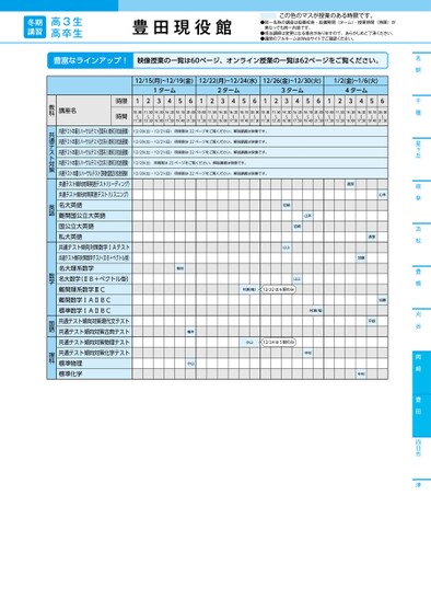 名駅千種星ヶ丘岐阜浜松豊橋刈谷岡崎豊田四日市津豊富なラインアップ!映像授業の一覧は60ページ、オンライン授業の一覧は62ページをご覧ください。12/15(月)~12/19(金)12/22(月)~12/24(水)12/26(金)~12/30(火)1/2(金)~1/6(火)1ターム2ターム3ターム4ターム12345612345612345612345610:0011:5014:3016:2018:1020:0010:0011:5014:3016:2018:1020:0010:0011:5014:3016:2018:1020:0010:0011:5014:3016:2018:1020:0011:3013:2016:0017:5019:4021:3011:3013:2016:0017:5019:4021:3011:3013:2016:0017:5019:4021:3011:3013:2016:0017:5019:4021:3012/20(土)・12/21(日)時間割は22ページをご覧ください。解説講義は映像です。12/20(土)・12/21(日)時間割は22ページをご覧ください。解説講義は映像です。12/20(土)・12/21(日)時間割は22ページをご覧ください。解説講義は映像です。12/20(土)時間割は22ページをご覧ください。解説講義は映像です。12/20(土)・12/21(日)時間割は22ページをご覧ください。解説講義は映像です。山本岩崎岩崎山上渡部山本渡部加藤山上村瀬(竜)12/22は6限のみ村瀬(竜)加藤平野小山12/24は5限のみ中村中村高田横井小山講座名時限時間共通テスト本番リハーサルテスト【理系6教科】校舎受験)共通テスト本番リハーサルテスト【文系6教科】校舎受験)共通テスト本番リハーサルテスト【理系3教科】校舎受験)共通テスト本番リハーサルテスト【文系3教科】校舎受験)共通テスト本番リハーサルテスト【英数国型】校舎受験)共通テスト傾向対策英語テスト(リーディング)共通テスト傾向対策英語テスト(リスニング)名大英語難関国公立大英語国公立大英語私大英語共通テスト傾向対策数学ⅠAテスト共通テスト傾向対策数学テスト(ⅡB+ベクトル型)名大理系数学名大数学(ⅡB+ベクトル型)難関理系数学ⅢC難関数学ⅠAⅡBC標準数学ⅠAⅡBC共通テスト傾向対策現代文テスト共通テスト傾向対策古典テスト共通テスト傾向対策物理テスト共通テスト傾向対策化学テスト標準物理標準化学教科共通テスト対策英語数学国語理科冬期講習高3生高卒生豊田現役館この色のマスが授業のある時限です。●同一名称の講座は設置校舎・設置期間(ターム)・授業時間(時限)が異なっても同一内容です。●担当講師は変更になる場合がありますので、あらかじめご了承ください。●講師のフルネームはWebサイトでご確認ください。