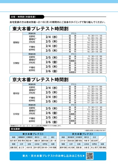 日程・時間割(対面受講)自宅受講の方は教材到着〜2/16(月)の期間内にご自身のタイミングで取り組んでください。東大本番プレテスト時間割2/4(水)2/5(木)2/4(水)2/5(木)2/5(木)2/6(金)2/5(木)2/6(金)2/4(水)2/5(木)2/4(水)2/5(木)2/5(木)2/6(金)2/5(木)2/6(金)テスト国語数学理科英語国語数学英語理科テスト国語数学地理歴史英語数学国語英語地理歴史テスト国語数学英語理科国語数学理科英語テスト国語数学英語地理歴史数学国語地理歴史英語9:30~11:1014:00~16:309:30~12:0014:00~16:0014:00~15:4016:00~18:3014:00~16:0016:20~18:509:30~12:0014:00~15:409:30~12:0014:00~16:0014:00~15:4016:00~18:3014:00~16:0016:20~18:509:30~11:0013:30~16:009:30~11:3013:30~16:3014:00~15:3015:50~18:2014:00~17:0017:20~19:209:30~11:3013:30~15:309:30~11:3013:30~15:0014:00~16:0016:20~18:2014:00~15:3015:50~17:50理類型文類型理系型文系型実施校舎名駅校豊橋校※浜松校千種校岐阜校実施校舎名駅校豊橋校※浜松校千種校岐阜校実施校舎名駅校豊橋校※浜松校千種校岐阜校実施校舎名駅校豊橋校※浜松校千種校岐阜校京大本番プレテスト時間割※豊橋校のみ1/31(土)・2/1(日)に上記と同じ時間帯でテストを実施します。担当講師東大本番プレテスト※講師は変更になる場合があります。京大本番プレテスト英語理類数学文類数学現代文古文漢文英語理系数学文系数学現代文古文高沢節子香坂季京岡田純一斎藤淳藤澤咲良三森一彦江本祐一西浦高志藤野真也中崎学松尾佳津子物理化学生物日本史世界史地理物理化学生物日本史世界史地理加藤武昭金仁守向井亮田中信司坂本新一中井隆顕瀧澤和樹小松知修西尾健小倉匡井上徳子河野貴樹東大・京大本番プレテストのお申し込みはこちら▶