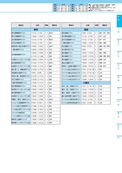 時限1限3限5限時間9:10〜10:4013:40〜15:1017:20〜18:50時限2限4限6限時間11:00〜12:3015:30〜17:0019:10〜20:40●同一名称の講座は設置校舎・設置期間・授業時間(時限)が異なっても同一内容です。●講師のフルネームはWebサイトでご確認ください。●担当講師は変更になる場合がありますので、あらかじめご了承ください。名駅千種星ヶ丘岐阜浜松豊橋刈谷岡崎豊田四日市津講座名日程時限講師名講座名日程時限講師名東大理類数学テスト東大文類数学テスト京大理系数学テスト京大文系数学テスト数学1/31(土)・2/1(日)5・6長谷川1/28(水)・1/29(木)3・4河村1/31(土)・2/1(日)3・4長谷川1/31(土)・2/1(日)1・2河村東京科学大(理工系)数学テスト1/28(水)・1/29(木)5・6長谷川一橋大数学テスト1/28(水)・1/29(木)3・4小田名大理系数学テスト1/28(水)・1/29(木)5・6高田2/12(木)・2/13(金)1・2笠岡名大数学テスト(ⅡB+ベクトル型)1/28(水)・1/29(木)5・6小栗東大国語テスト京大理系国語テスト京大文系国語テスト一橋大国語テスト名大国語テスト名大現代文テスト阪大国語テスト神大国語テスト早大国語テスト国語2/2(月)・2/3(火)3・4福永・坂下・野村1/31(土)・2/1(日)1・2武下・山村1/31(土)・2/1(日)3・4武下・坂下1/28(水)・1/29(木)5・6福永・伊藤2/4(水)・2/5(木)5・6高橋・河合・野村2/4(水)5・6高橋1/28(水)・1/29(木)3・4福永・伊藤1/26(月)・1/27(火)5・6高橋・伊藤・野村1/26(月)・1/27(火)5・6高橋・山村岐大理系数学テスト2/16(月)・2/17(火)3・4長谷川南山大国語テスト1/28(水)・1/29(木)3・4齊藤・山村岐大数学テスト(ⅡB+ベクトル型)2/16(月)・2/17(火)3・4福眞同志社・立命館大国語テスト1/26(月)・1/27(火)3・4日嵩・鈴木静大(理・工・情報)数学テスト2/16(月)・2/17(火)3・4野村ファイナル国公立大現代文テスト2/10(火)・2/11(水・祝)3・4武下浜松医科大数学テスト2/8(日)・2/9(月)3・4崎ファイナル国公立大古文テスト2/10(火)・2/11(水・祝)5・6山村名市大(医・薬)数学テスト2/16(月)・2/17(火)3・4小田ファイナル私大現代文テスト1/26(月)・1/27(火)5・6佐藤名工大数学テスト2/16(月)・2/17(火)3・4高田ファイナル私大古文テスト1/28(水)・1/29(木)3・4河合三重大理系数学テスト2/16(月)・2/17(火)3・4谷口小論文阪大理系数学テスト1/30(金)・1/31(土)3・4大庭名大(法)小論文テスト2/10(火)・2/11(水・祝)3・4大田阪大数学テスト(ⅡB+ベクトル型)1/28(水)・1/29(木)5・6河原慶大(法)小論文テスト1/24(土)・1/25(日)3・4大田神大理系数学テスト1/26(月)・1/27(火)5・6杉山慶大(経済)小論文テスト1/26(月)・1/27(火)3・4大田神大数学テスト(ⅡB+ベクトル型)1/28(水)・1/29(木)3・4杉山慶大(総合政策)小論文テスト1/28(水)・1/29(木)3・4大田早慶大(理工)数学テスト1/22(木)・1/23(金)5・6長谷川ファイナル人文・教育系対策小論文テスト1/31(土)・2/1(日)3・4大田ハイレベル医進数学テスト2/9(月)・2/10(火)3・4河村ファイナル社会科学系対策小論文テスト2/4(水)・2/5(木)3・4大田ファイナル国公立大理系数学テスト2/13(金)・2/14(土)5・6森本ファイナル国公立大数学テスト(ⅡB+ベクトル型)2/13(金)・2/14(土)5・6大庭ファイナル数学ⅢC1/26(月)・1/27(火)3・4大庭ファイナル数学(ⅡB+ベクトル型)1/30(金)・1/31(土)5・6森本数学ⅢC必勝チェック1/28(水)・1/29(木)5・6小倉数学必勝チェック(ⅡB+ベクトル型)1/30(金)・1/31(土)5・6市野