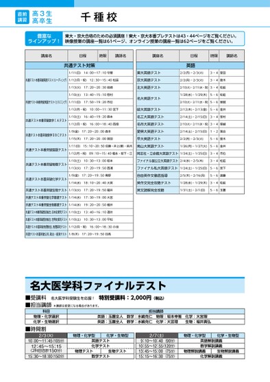 豊富なラインアップ!東大・京大合格のための必須講座!東大・京大本番プレテストは43・44ページをご覧ください。映像授業の講座一覧は61ページ、オンライン授業の講座一覧は62ページをご覧ください。共通テスト本番突破歴史総合,日本史探究テスト13:40〜16:10酒井1/10(土)1/10(土)10:30〜13:00平松共通テスト本番突破歴史総合,世界史探究テスト講座名日程時限講師名共通テスト対策1/11(日)14:00〜17:10守屋共通テスト本番突破英語テスト(リーディング)1/12(月・祝)12:30〜15:40松延1/13(火)17:20〜20:30岩崎1/10(土)13:40〜15:10笹村共通テスト本番突破英語テスト(リスニング)1/11(日)17:50〜19:20市位1/12(月・祝)10:00〜11:30宮下1/10(土)16:40〜19:20森本共通テスト本番突破数学ⅠAテスト共通テスト本番突破地理総合,地理探究テスト共通テスト本番突破公共,政治・経済テスト講座名1/12(月・祝)日程1/8(木)16:00〜18:30小池17:20〜19:50日髙時限講師名東大理類数学テスト東大文類数学テスト京大理系数学テスト京大文系数学テスト名大英語テスト北大理系数学テスト岐大英語テスト名大理系数学テスト名工大英語テスト数学2/2(月)・2/3(火)月5・6野村田1/26(月)・1/27(火)2/2(月)・2/3(火)3・43・4福眞登木2/2(月)・2/3(火)2/10(火)・2/11(水・祝)1・23・4市野松延同志社・立命館ファイナル国公立大ファイナル国公立ファイナル私大2/2(月)・2/3(火)(水)・/9木)1・2村瀬(宗)延ファイナル私大2/8(日)・2/9(月)2/10(火)・2/11(水・祝)5・65・6笠岡塚越1/26(月)・1/27(火)2/12(木)・2/13(金)5・65・6三田村金井名大(法)小論2/10(火)・2/11(水・祝)2/14(土)・2/15(日)3・43・4小倉笹村東大国語テスト名大国語テスト名大現代文テス早大国語テスト南山大国語テス直前講習高3生高卒生千種校共通テスト本番突破化学テスト1/9(金)17:20〜19:50青野1/14(水)18:10〜20:40大宮ファイナル数学(ⅡB共通テスト本番突破生物テスト1/13(火)17:20〜19:50福井数学ⅢC必勝チ共通テスト本番突破化学基礎テスト1/14(水)17:30〜19:00大宮共通テスト本番突破生物基礎テスト1/14(水)19:20〜20:50福井1/12(月・祝)16:00〜18:40西畑名大数学テスト(ⅡB+ベクトル型)2/10(火)・2/11(水・祝)市大語テスト2/10(火)・2/11(水・祝)3・43・4宮田塚越共通テスト本番突破数学ⅡBCテスト1/9(金)17:20〜20:00森本1/15(木)17:20〜20:00宮田岐大理系数学テスト2/11(水・祝)・2/12(木)2/14(土)・2/15(日)3・41・2三田村落合名市大(医・薬)数学テスト語テスト2/8(日)・2/9(月)2/2(月)・2/3(火)4・55・6水嶋登木共通テスト本番突破国語テスト1/11(日)15:10〜20:50佐藤・井上(摩)・鈴木名工大数学テスト2/14(土)・2/15(日)1/26(月)・1/27(火)1・25・6小倉金井1/12(月・祝)09:10〜15:40福永・坂下・江ファイナル国公立大理系数学テスト志社・命館大語テスト1/24(土)・1/25(日)2/10(火)・2/11(水・祝)3・43・4森本市位共通テスト本番突破物理テスト共通テスト本番突破化学テスト1/10(土)10:30〜13:00坂本1/13(火)17:20〜19:50西浦1/9(金)17:20〜19:50青野1/14(水)18:10〜20:40大宮ファイナル国公立大数学テスト(ⅡB+ベクトル型)2/8(日)・2/9(月)ァイル公立英テ2/4(水)・2/5(木)3・43・4小倉松延ファイナル私大英語テストファイナル数学ⅢC自由英作文徹底指導1/22(木)・1/23(金)1/24(土)・1/25(日)5・65・6小倉宮下1/28(水)・1/29(木)2/5(木)・2/16(月)5・65・6森本遠藤ファイナル数学(ⅡB+ベクトル型)1/26(月)・1/27(火)作文全攻略テト1/28(水)・1/29(木)5・63・4水嶋松延共通テスト本番突破生物テスト1/13(火)17:20〜19:50福井数学ⅢC必勝チェック1/26(月)・1/27(火)1/31(土)・2/1(日)5・65・6西畑玉置共通テスト本番突破化学基礎テスト1/14(水)17:30〜19:00大宮国語共通テスト本番突破生物基礎テスト1/14(水)19:20〜20:50福井東大国語テスト1/26(月)・1/27(火)5・6武下・井上(摩)・野村共通テスト本番突破歴史総合,日本史探究テスト1/10(土)13:40〜16:10酒井1ページ共通テスト本番突破歴史総合,世界史探究テスト1/10(土)10:30〜13:00平松共通テスト本番突破地理総合,地理探究テスト1/12(月・祝)16:00〜18:30小池共通テスト本番突破公共,政治・経済テスト1/8(木)17:20〜19:50日髙東大英語テスト京大英語テスト北大英語テスト名大英語テスト英語2/2(月)・2/3(火)3・4室田2/2(月)・2/3(火)3・4登木2/10(火)・2/11(水・祝)3・4松延1/28(水)・1/29(木)5・6松延名大国語テスト●2025年度/直前講習/中部/千種/高3・卒生/パターン7043/2025_59_4_412/12(木)・2/13(金)5・6高橋・山村・江名大現代文テスト早大国語テスト南山大国語テスト2/13(金)5・6高橋2/2(月)・2/3(火)3・4武下・井上(摩)1/22(木)・1/23(金)5・6日嵩・井上(摩)同志社・立命館大国語テスト1/24(土)・1/25(日)1・2佐藤・井上(摩)ファイナル国公立大現代文テスト2/14(土)・2/15(日)5・6福永ファイナル国公立大古文テスト2/14(土)・2/15(日)3・4坂下ファイナル私大現代文テスト1/28(水)・1/29(木)5・6佐藤ファイナル私大古文テスト1/24(土)・1/25(日)1・2横井2/10(火)・2/11(水・祝)5・6塚越岐大英語テスト名大医学科ファイナルテスト2/12(木)・2/13(金)名大(法)小論文テスト5・6金井2/14(土)・2/15(日)3・4笹村名工大英語テスト名大医学科受験生を応援!特別受講料:2,000円(税込)3・4塚越名市大英語テスト■受講料■担当講師*講師は変更になる場合が