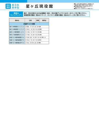 直前講習高3生高卒生星ヶ丘現役館●同一名称の講座は設置校舎・設置期間・授業時間(時限)が異なっても同一内容です。●担当講師は変更になる場合がありますので、あらかじめご了承ください。●講師のフルネームはWebサイトでご確認ください。豊富なラインアップ!東大・京大合格のための必須講座!東大・京大本番プレテストは43・44ページをご覧ください。映像授業の講座一覧は61ページ、オンライン授業の講座一覧は62ページをご覧ください。講座名日程時限講師名共通テスト対策共通テスト本番突破英語テスト(リーディング)1/9(金)17:20〜20:30村瀬共通テスト本番突破英語テスト(リスニング)1/10(土)18:20〜19:50松岡共通テスト本番突破数学ⅠAテスト1/11(日)13:00〜15:40水嶋共通テスト本番突破数学ⅡBCテスト1/11(日)16:00〜18:40水嶋共通テスト本番突破国語テスト1/12(月・祝)13:00〜18:40平野・江共通テスト本番突破物理テスト1/10(土)15:30〜18:00荒木共通テスト本番突破化学テスト1/7(水)18:00〜20:30青野