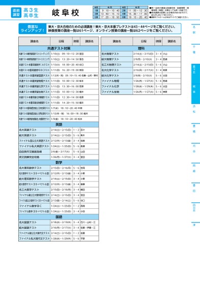 名駅千種星ヶ丘岐阜浜松豊橋刈谷岡崎豊田四日市津豊富なラインアップ!東大・京大合格のための必須講座!東大・京大本番プレテストは43・44ページをご覧ください。映像授業の講座一覧は61ページ、オンライン授業の講座一覧は62ページをご覧ください。講座名日程時限講師名講座名日程時限講師名名大物理テスト岐大物理テスト名工大物理テスト名大化学テスト岐大化学テストファイナル物理ファイナル化学ファイナル生物理科2/14(土)・2/15(日)3・4小山2/9(月)・2/10(火)3・4西浦2/14(土)・2/15(日)5・6小山2/16(月)・2/17(火)3・4若原2/9(月)・2/10(火)5・6太田1/26(月)・1/27(火)5・6西浦1/28(水)・1/29(木)5・6太田1/26(月)・1/27(火)5・6榊原共通テスト対策共通テスト本番突破英語テスト(リーディング)1/10(土)09:10〜12:20室田共通テスト本番突破英語テスト(リスニング)1/10(土)13:20〜14:50落合共通テスト本番突破数学ⅠAテスト1/13(火)18:00〜20:40谷口共通テスト本番突破数学ⅡBCテスト1/11(日)16:20〜19:00宮田共通テスト本番突破国語テスト1/12(月・祝)09:10〜15:40佐藤・山村・野村共通テスト本番突破物理テスト1/11(日)10:00〜12:30坂本共通テスト本番突破化学テスト1/11(日)13:30〜16:00若原共通テスト本番突破生物テスト1/11(日)10:00〜12:30福井共通テスト本番突破化学基礎テスト1/11(日)12:30〜14:00若原共通テスト本番突破生物基礎テスト1/11(日)14:20〜15:50福井共通テスト本番突破歴史総合,日本史探究テスト1/7(水)18:10〜20:40中垣共通テスト本番突破歴史総合,世界史探究テスト1/12(月・祝)16:00〜18:30堀井共通テスト本番突破地理総合,地理探究テスト1/9(金)18:10〜20:40松本英語名大英語テスト岐大英語テスト2/14(土)・2/15(日)1・2百々2/14(土)・2/15(日)5・6青木ファイナル国公立大英語テスト2/12(木)・2/13(金)3・4岩崎ファイナル私大英語テスト1/24(土)・1/25(日)5・6長瀬自由英作文徹底指導英文読解完全攻略2/6(金)・2/17(火)5・6山田1/26(月)・1/27(火)3・4室田数学名大理系数学テスト2/15(日)・2/16(月)5・6笠岡名大数学テスト(ⅡB+ベクトル型)2/12(木)・2/13(金)3・4小栗岐大理系数学テスト2/14(土)・2/15(日)3・4小栗岐大数学テスト(ⅡB+ベクトル型)2/12(木)・2/13(金)3・4後藤名工大数学テスト2/15(日)・2/16(月)3・4嶋田ファイナル国公立大理系数学テスト2/14(土)・2/15(日)3・4宮田ファイナル国公立大数学テスト(ⅡB+ベクトル型)2/13(金)・2/14(土)5・6谷口ファイナル数学ⅢC1/24(土)・1/25(日)1・2西畑ファイナル数学(ⅡB+ベクトル型)1/24(土)・1/25(日)3・4小田国語名大国語テスト岐大国語テスト2/18(水)・2/19(木)3・4石川・山村・江2/16(月)・2/17(火)3・4佐藤・伊藤・江ファイナル国公立大現代文テスト2/14(土)・2/15(日)1・2佐藤ファイナル私大現代文テスト1/28(水)・1/29(木)5・6平野直前講習高3生高卒生岐阜校時限1限3限5限時間9:10〜10:4013:40〜15:1017:20〜18:50時限2限4限6限時間11:00〜12:3015:30〜17:0019:10〜20:40●同一名称の講座は設置校舎・設置期間・授業時間(時限)が異なっても同一内容です。●担当講師は変更になる場合がありますので、あらかじめご了承ください。●講師のフルネームはWebサイトでご確認ください。