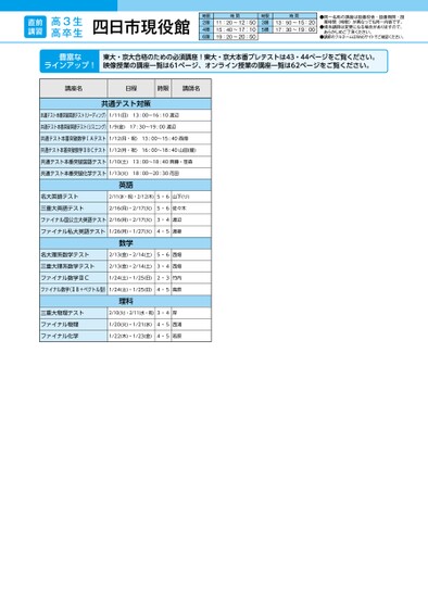 直前講習高3生高卒生四日市現役館時限2限4限6限時間11:20〜12:5015:40〜17:1019:20〜20:50時限3限5限時間13:50〜15:2017:30〜19:00●同一名称の講座は設置校舎・設置期間・授業時間(時限)が異なっても同一内容です。●担当講師は変更になる場合がありますので、あらかじめご了承ください。●講師のフルネームはWebサイトでご確認ください。豊富なラインアップ!東大・京大合格のための必須講座!東大・京大本番プレテストは43・44ページをご覧ください。映像授業の講座一覧は61ページ、オンライン授業の講座一覧は62ページをご覧ください。講座名日程時限講師名共通テスト対策共通テスト本番突破英語テスト(リーディング)1/11(日)13:00〜16:10渡辺共通テスト本番突破英語テスト(リスニング)1/9(金)17:30〜19:00渡辺共通テスト本番突破数学ⅠAテスト1/12(月・祝)13:00〜15:40西畑共通テスト本番突破数学ⅡBCテスト1/12(月・祝)16:00〜18:40山田(龍)共通テスト本番突破国語テスト1/10(土)13:00〜18:40齊藤・笹森共通テスト本番突破化学テスト1/13(火)18:00〜20:30花田英語名大英語テスト三重大英語テスト2/11(水・祝)・2/12(木)5・6山下(り)2/16(月)・2/17(火)5・6佐々木ファイナル国公立大英語テスト2/16(月)・2/17(火)3・4渡辺ファイナル私大英語テスト1/26(月)・1/27(火)4・5渡邉数学名大理系数学テスト2/13(金)・2/14(土)5・6西畑三重大理系数学テスト2/13(金)・2/14(土)3・4西畑ファイナル数学ⅢC1/24(土)・1/25(日)2・3竹内ファイナル数学(ⅡB+ベクトル型)1/24(土)・1/25(日)4・5高原三重大物理テストファイナル物理ファイナル化学理科2/10(火)・2/11(水・祝)3・4岸1/20(火)・1/21(水)4・5西浦1/22(木)・1/23(金)4・5若原