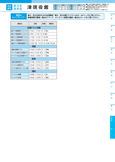名駅千種星ヶ丘岐阜浜松豊橋刈谷岡崎豊田四日市津豊富なラインアップ!東大・京大合格のための必須講座!東大・京大本番プレテストは43・44ページをご覧ください。映像授業の講座一覧は61ページ、オンライン授業の講座一覧は62ページをご覧ください。講座名日程時限講師名共通テスト対策共通テスト本番突破英語テスト(リーディング)1/10(土)13:00〜16:10渡辺共通テスト本番突破英語テスト(リスニング)1/8(木)17:30〜19:00渡辺共通テスト本番突破数学ⅠAテスト1/11(日)13:00〜15:40河合共通テスト本番突破数学ⅡBCテスト1/11(日)16:00〜18:40河合共通テスト本番突破国語テスト1/12(月・祝)13:00〜18:40岡・井上(淳)英語三重大英語テスト2/15(日)・2/16(月)4・5桑野ファイナル国公立大英語テスト2/10(火)・2/11(水・祝)4・5伊藤ファイナル私大英語テスト1/28(水)・1/29(木)3・4渡辺数学三重大理系数学テスト2/13(金)・2/14(土)5・6嶋田ファイナル数学ⅢC1/26(月)・1/27(火)4・5河村ファイナル数学(ⅡB+ベクトル型)1/23(金)・1/24(土)4・5河村理科ファイナル物理ファイナル化学1/30(金)・1/31(土)5・6岸1/28(水)・1/29(木)5・6冨永直前講習高3生高卒生津現役館時限3限5限時間13:50〜15:2017:30〜19:00時限4限6限時間15:40〜17:1019:20〜20:50●同一名称の講座は設置校舎・設置期間・授業時間(時限)が異なっても同一内容です。●担当講師は変更になる場合がありますので、あらかじめご了承ください。●講師のフルネームはWebサイトでご確認ください。