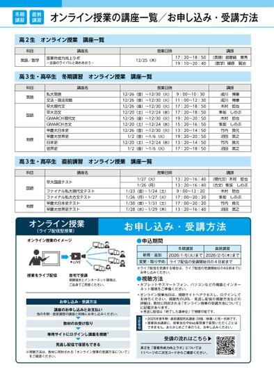 冬期講習直前講習オンライン授業の講座一覧/お申し込み・受講方法高2生オンライン授業講座一覧科目英語/数学講座名答案作成力向上ラボ-全国のライバルと高めあおう-授業日時講師12/25(木)17:20~18:5019:10~20:40(英語)胡摩﨑章秀(数学)原賢治高3生・高卒生冬期講習オンライン授業講座一覧科目英語国語地歴講座名私大英語文法・語法攻略早大現代文早大古文GMARCH現代文GMARCH古文早慶大日本史早慶大世界史日本史世界史授業日時12/26(金)~12/30(火)12/26(金)~12/30(火)12/26(金)~12/30(火)12/20(土)~12/24(水)12/26(金)~12/30(火)12/20(土)~12/24(水)12/26(金)~12/30(火)1/2(金)~1/6(火)12/20(土)~12/24(水)1/2(金)~1/6(火)9:00~10:3011:00~12:3017:20~18:5017:20~18:5019:20~20:5015:20~16:5013:20~14:5019:20~20:5013:20~14:5017:20~18:50講師成川博康成川博康木村哲也隼坂しのぶ木村哲也隼坂しのぶ竹内良元沼田英之竹内良元沼田英之高3生・高卒生直前講習オンライン授業講座一覧科目国語地歴講座名早大国語テストファイナル私大現代文テストファイナル私大古文テスト早慶大日本史テスト早慶大世界史テストオンライン授業(ライブ配信型授業)オンライン授業のイメージILVE授業をライブ配信自宅で受講視聴端末とインターネット環境は、ご自身でご用意ください。授業日時1/27(火)1/26(月)1/23(金)・1/24(土)1/26(月)・1/27(火)1/30(金)・1/31(土)1/28(水)・1/29(木)13:20~16:4013:20~16:409:00~12:2017:00~20:2017:00~20:2013:20~16:40講師(現代文)木村哲也(古文)隼坂しのぶ木村哲也隼坂しのぶ竹内良元沼田英之お申し込み・受講方法●申込期間冬期講習直前講習新規・追加変更・取りやめ2026/1/6(火)までライブ配信の受講開始日の4日前まで2026/2/5(木)まで※ライブ配信を受講する場合は、ライブ配信の受講開始日の4日前までにお申し込みください。●視聴方法タブレットやスマートフォン、パソコンなどの機器とインターネット環境をご準備ください。オンライン授業当日は、視聴サイトへアクセスし、ログインしてお待ちください。視聴先のURL・見逃し配信の視聴方法などの詳細は、教材に同封される「オンライン授業の受講方法について」に記載があります。※見逃し配信は「終了した講単位」で視聴可能です。2025年度冬期・直前講習同名講座(対面/映像)と同一内容です。授業担当講師に、授業当日やWeb質問書で質問いただくことはできません。あらかじめご了承のうえ、お申し込みください。注意事項受講の流れはこちら▶高2生「答案作成力向上ラボ」については11ページの二次元コードからご確認ください。お申し込み・受講方法講座のお申し込みとお支払い他の冬期・直前講習の講座と同様にお申し込みください。教材のお受け取り専用サイトにログインし講義を視聴※見逃し配信で復習もできる※視聴方法は、教材に同封される「オンライン授業の受講方法について」をご確認ください。